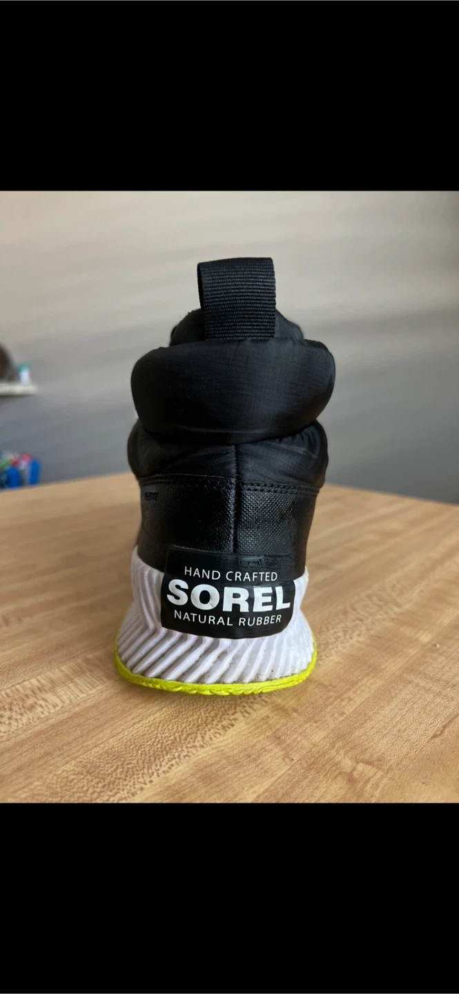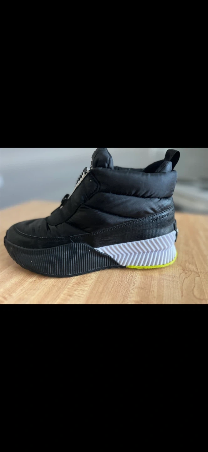 Selling a pair of Sorel Kinetic Breakthru Conquest boots in size 7.5. They're black with a white and neon green sole. These are super stylish and comfortable!