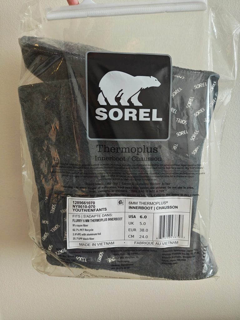 BRAND NEW! Sorel Thermoplus Innerboot for youth, size 6 (US). These innerboots provide superb warmth, moisture transfer, comfort, and durability. They feature an advanced four-layer construction to keep feet warm and dry. Made in Vietnam, these are 62.7% PET Recycle with aluminum foil for added insulation. Comes in original packaging!