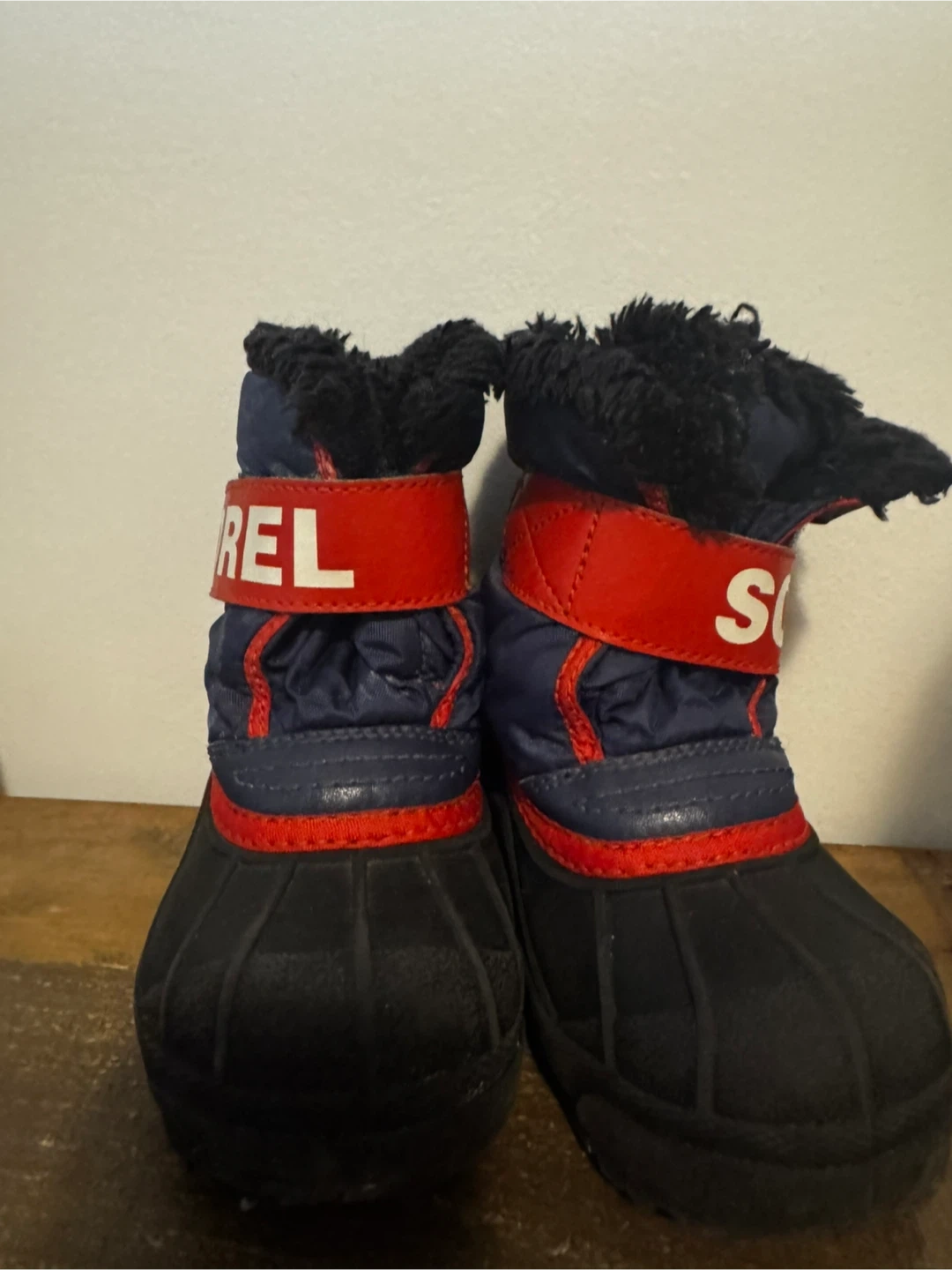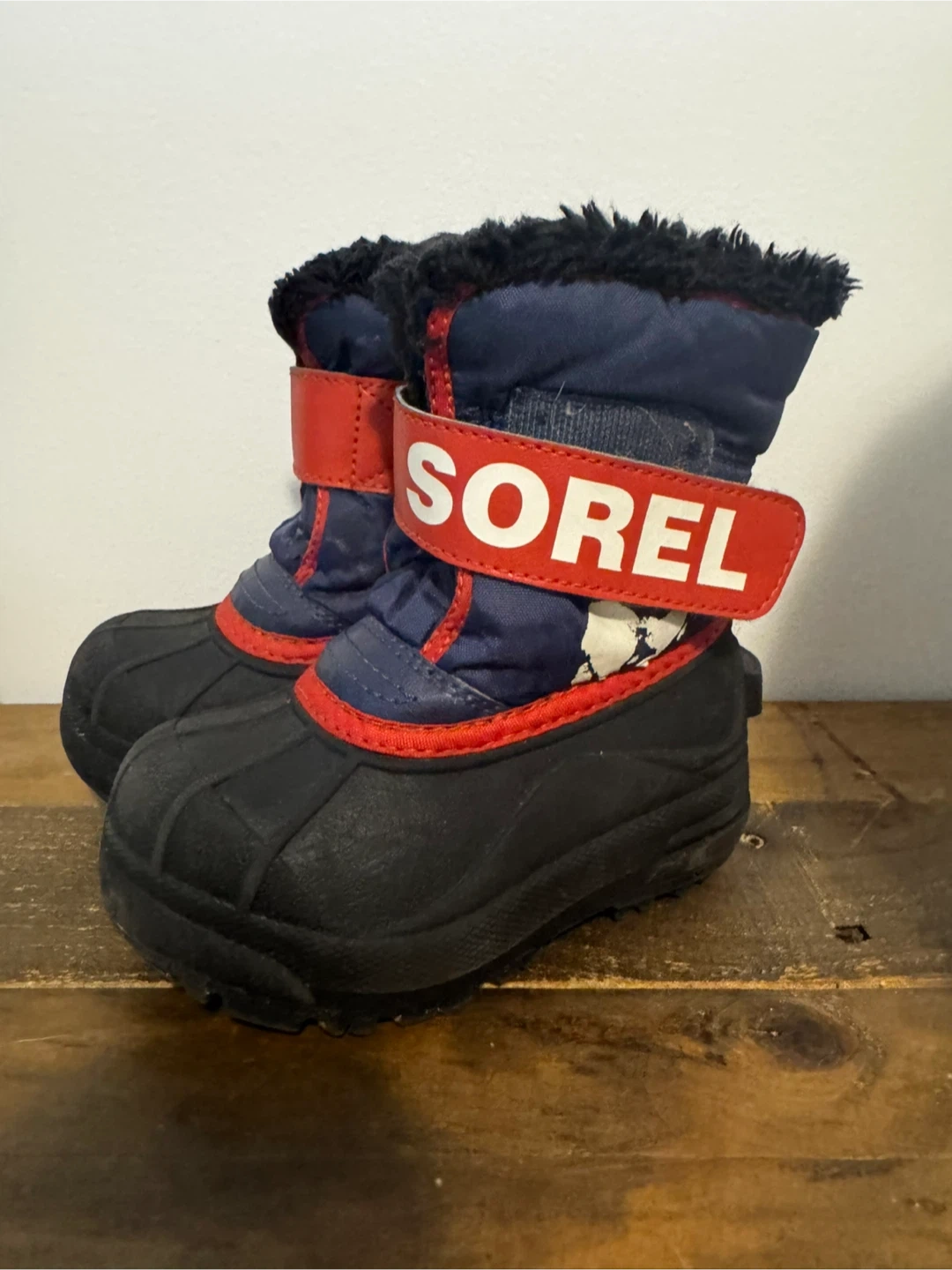 These are a pair of Sorel Toddler Snow Commander boots. They're navy blue with black soles and red detailing. Perfect for keeping little feet warm and dry during the winter months! Size 7