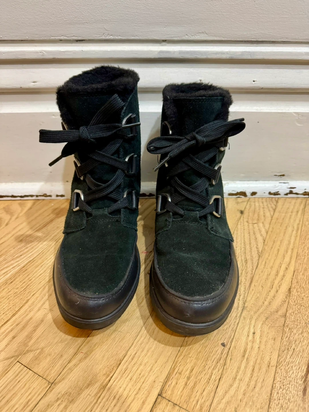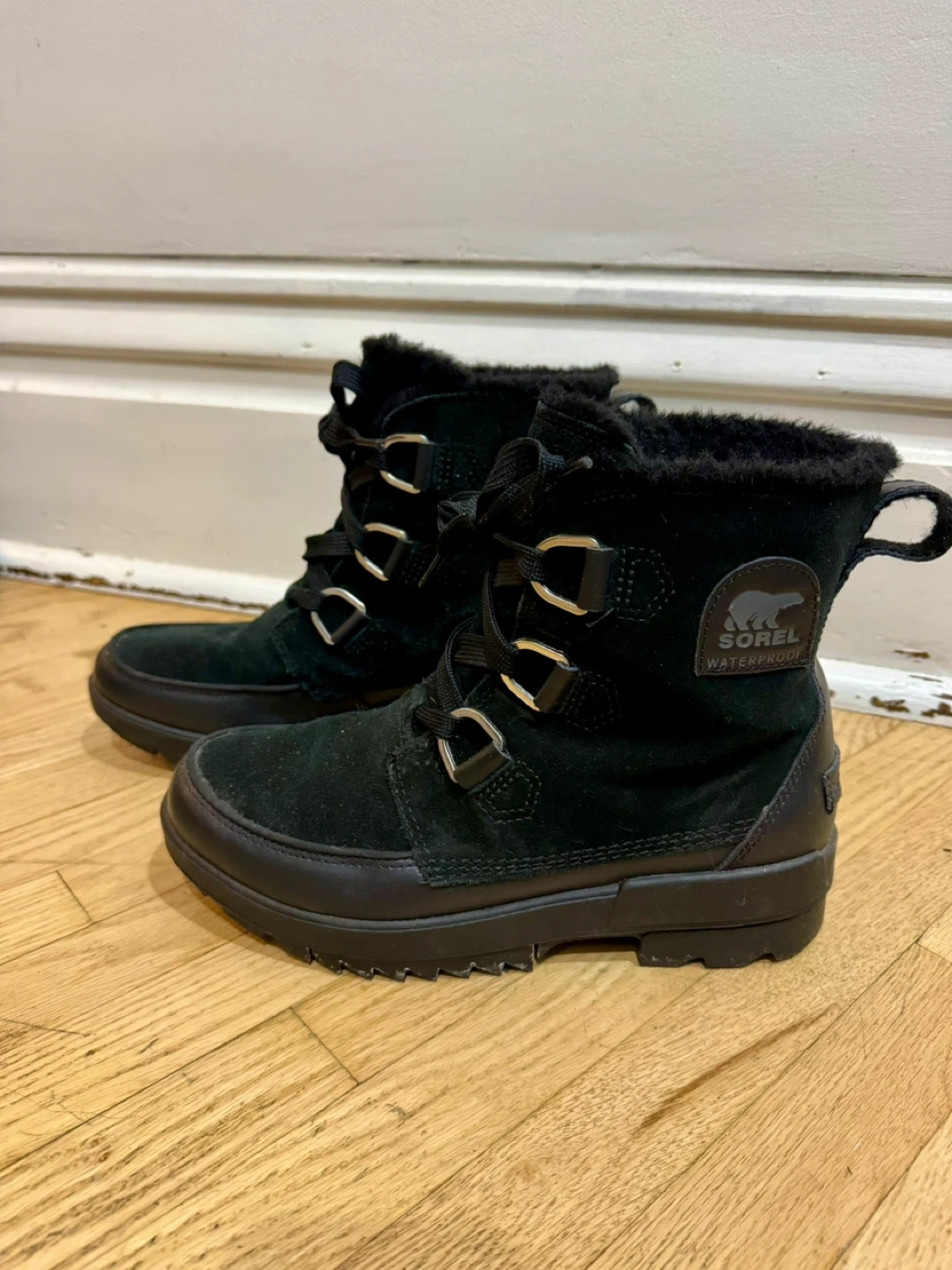 48These Sorel winter boots are perfect for keeping your feet warm and dry! They are waterproof and have a stylish black design. Great for snowy days or just cold weather! Only worn twice!