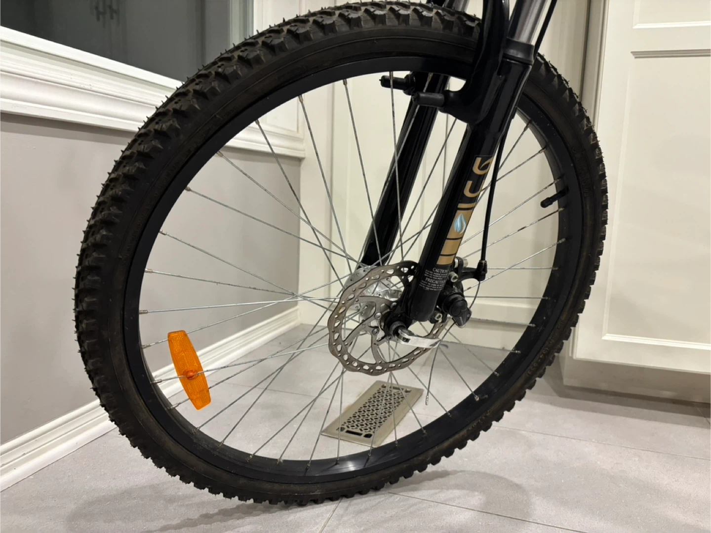 This CCM Torrent AL mountain bike features a gold aluminum frame and 21 speeds. It's a dual suspension bike with disc brakes. Recommended for riders 5'8" to 6'0".