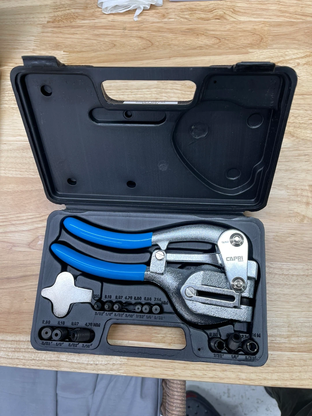 This Capri sheet metal punch set includes a punch tool and various punch sizes. The tool has blue handles and comes in a black carrying case. It's designed for punching holes in sheet metal. Includes multiple punch sizes for versatility!