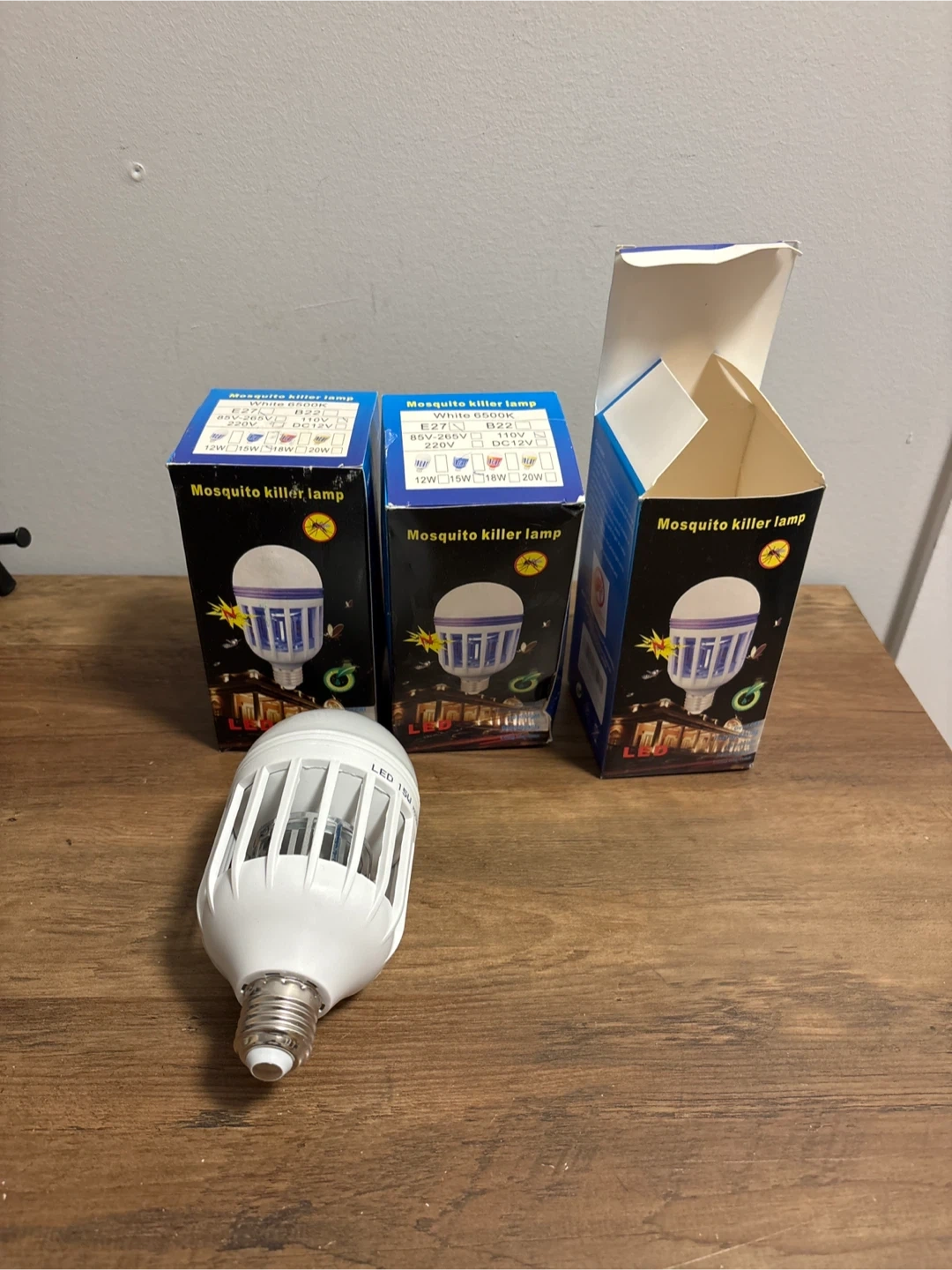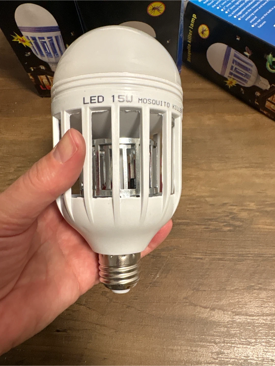 This is a 15W LED mosquito killer lamp bulb. It's designed to attract and eliminate mosquitos. This bulb fits standard E27/B22 sockets.