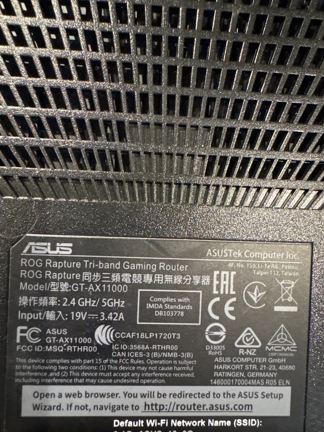This is an ASUS ROG Rapture Tri-band Gaming Router. It operates at 2.4 GHz and 5 GHz. The input is 19V, 3.42A.