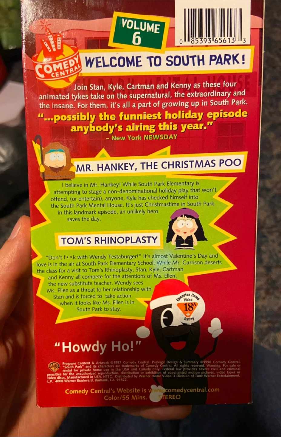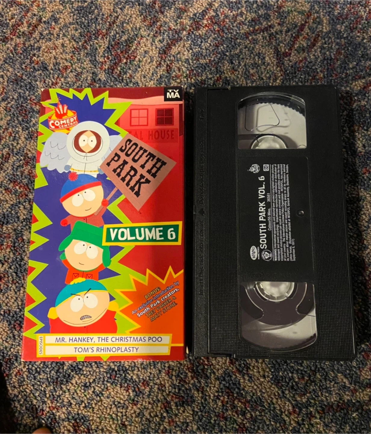 99Selling a South Park Volume 6 VHS tape! The tape comes with its original case, featuring Mr. Hankey and Tom's Rhinoplasty episodes I have not tested it but it looks good Major intersections are burnhamthorpe and confederation parkway Mississauga Vintage Retro Comedy Cartman Stan Kenny Kyle