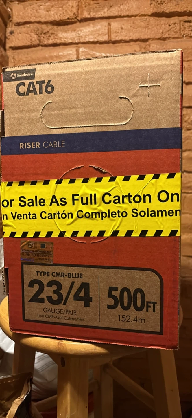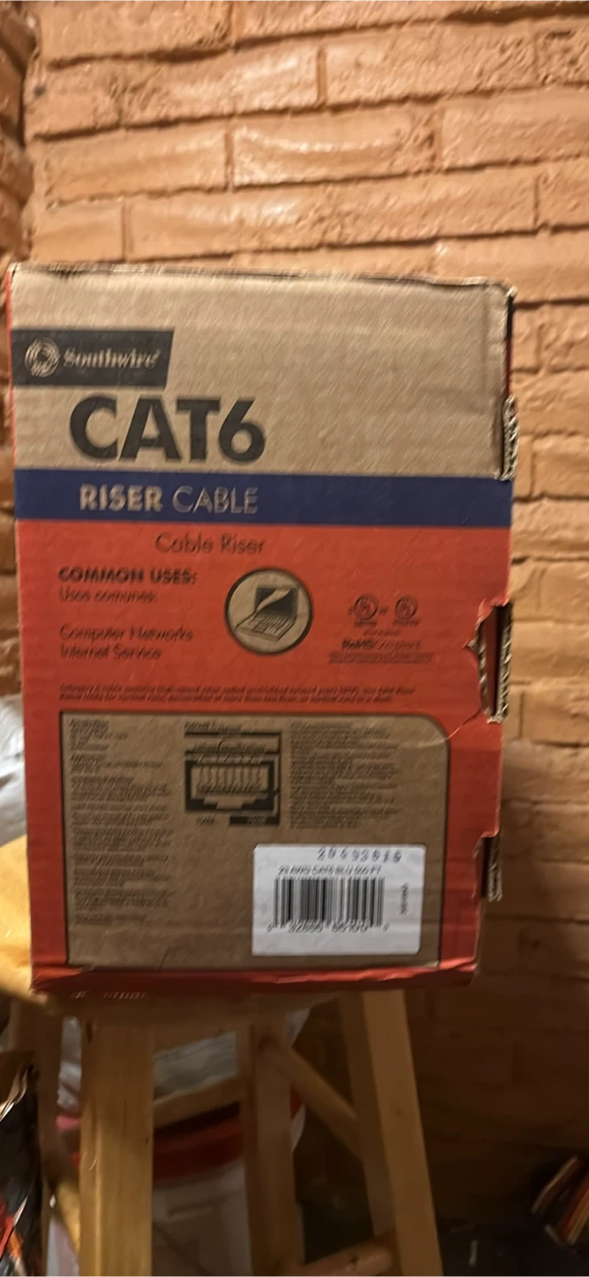 60Selling a Southwire CAT6 Riser Cable. It's a 23/4 gauge cable, 500ft in length. It is brand new never used in box. I got it as a gift.