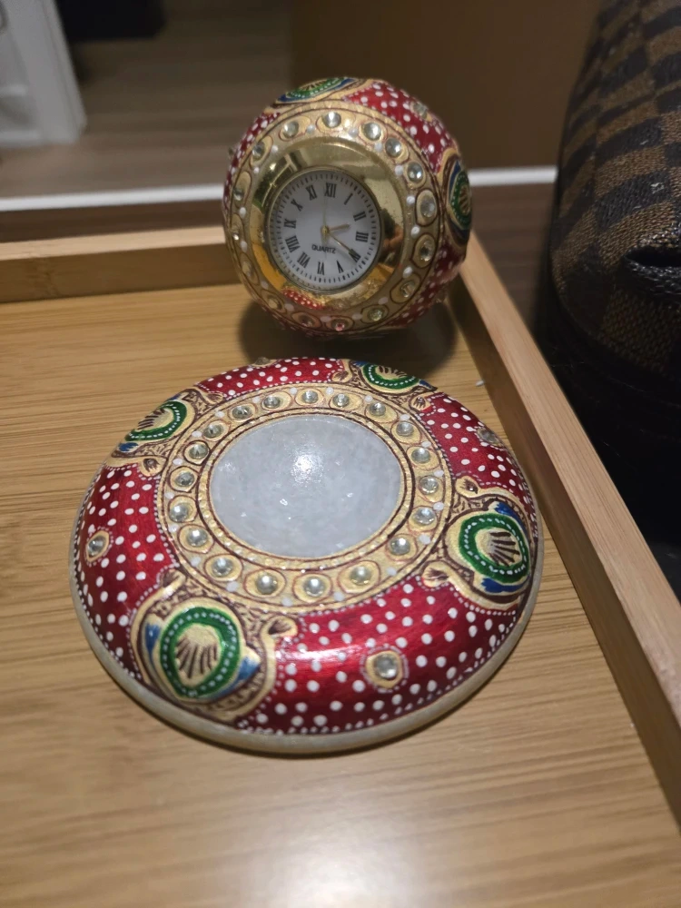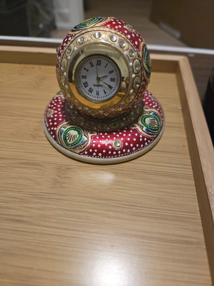 70This is a decorative quartz clock with a marble stand. It has a unique design with red and gold accents. The clock face is easy to read, and it would make a great addition to any room!