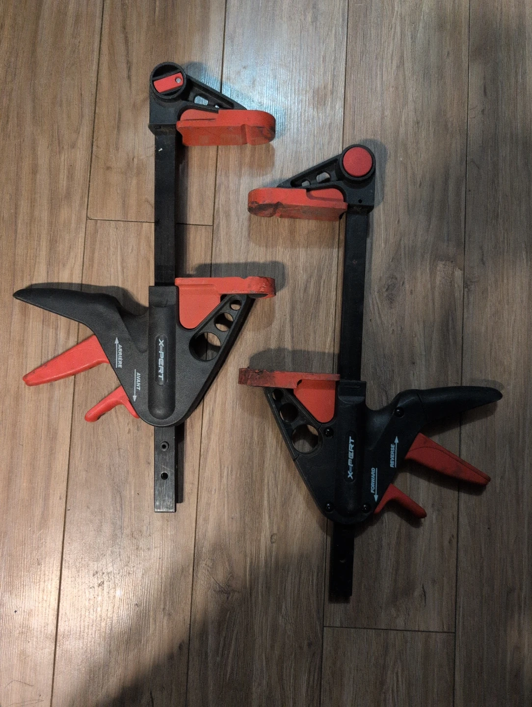 Two Irwin QuickGrip bar clamps and two X-PERT quick-release clamps. These clamps are useful for woodworking projects and general repairs. They offer a quick and secure grip for holding materials together.