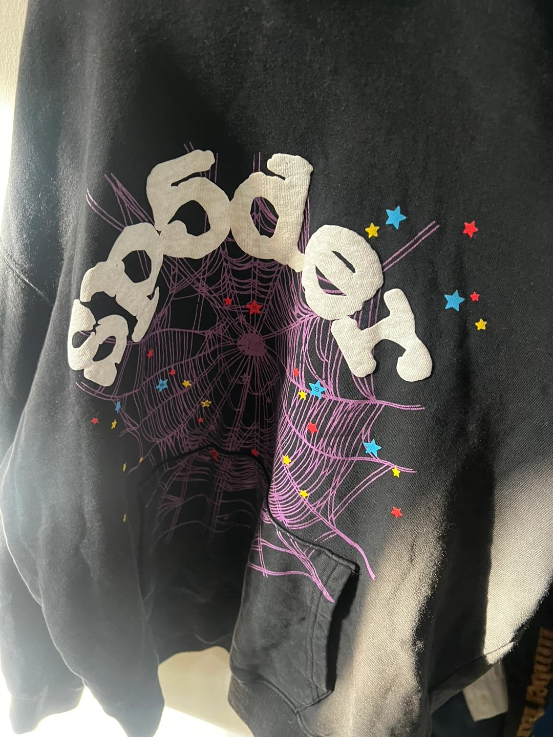 10Selling a SP5DER black hoodie! It features a spiderweb design with colourful stars. It's in great condition and ready for a new home!