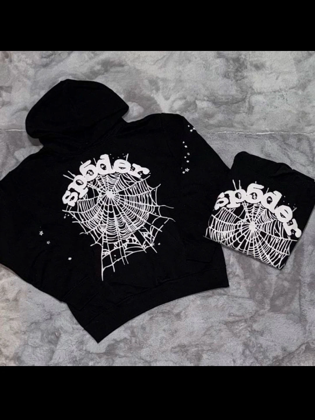 Selling a black Sp5der hoodie with a white spiderweb design! It's in great condition and ready for a new home