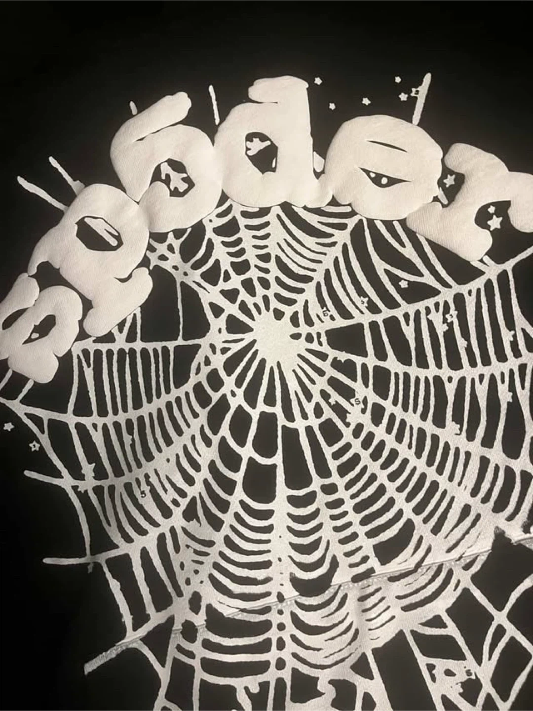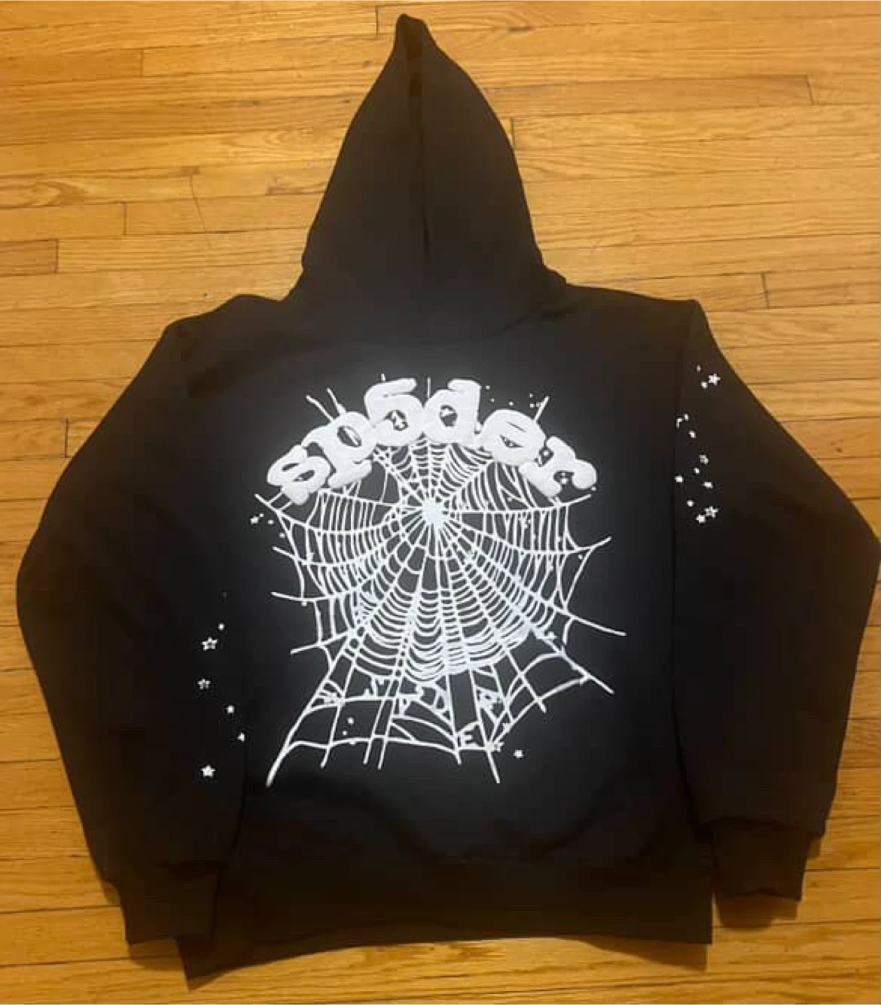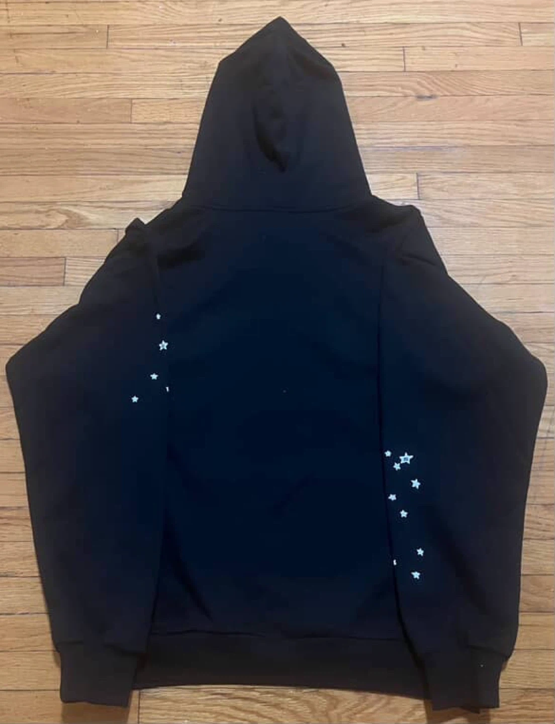 29Selling a black Sp5der hoodie in size medium! It features a cool spiderweb design on the back and stars on the sleeves. Perfect for adding some streetwear style to your wardrobe!