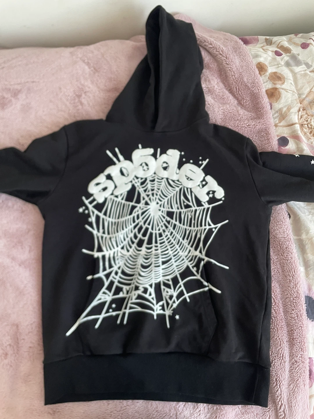 10Selling a black Sp5der hoodie in size small! It has the classic spiderweb design on the front. Perfect for adding a bit of streetwear style to your wardrobe