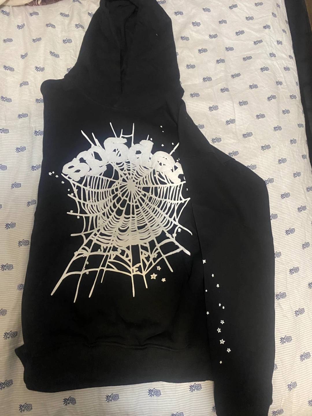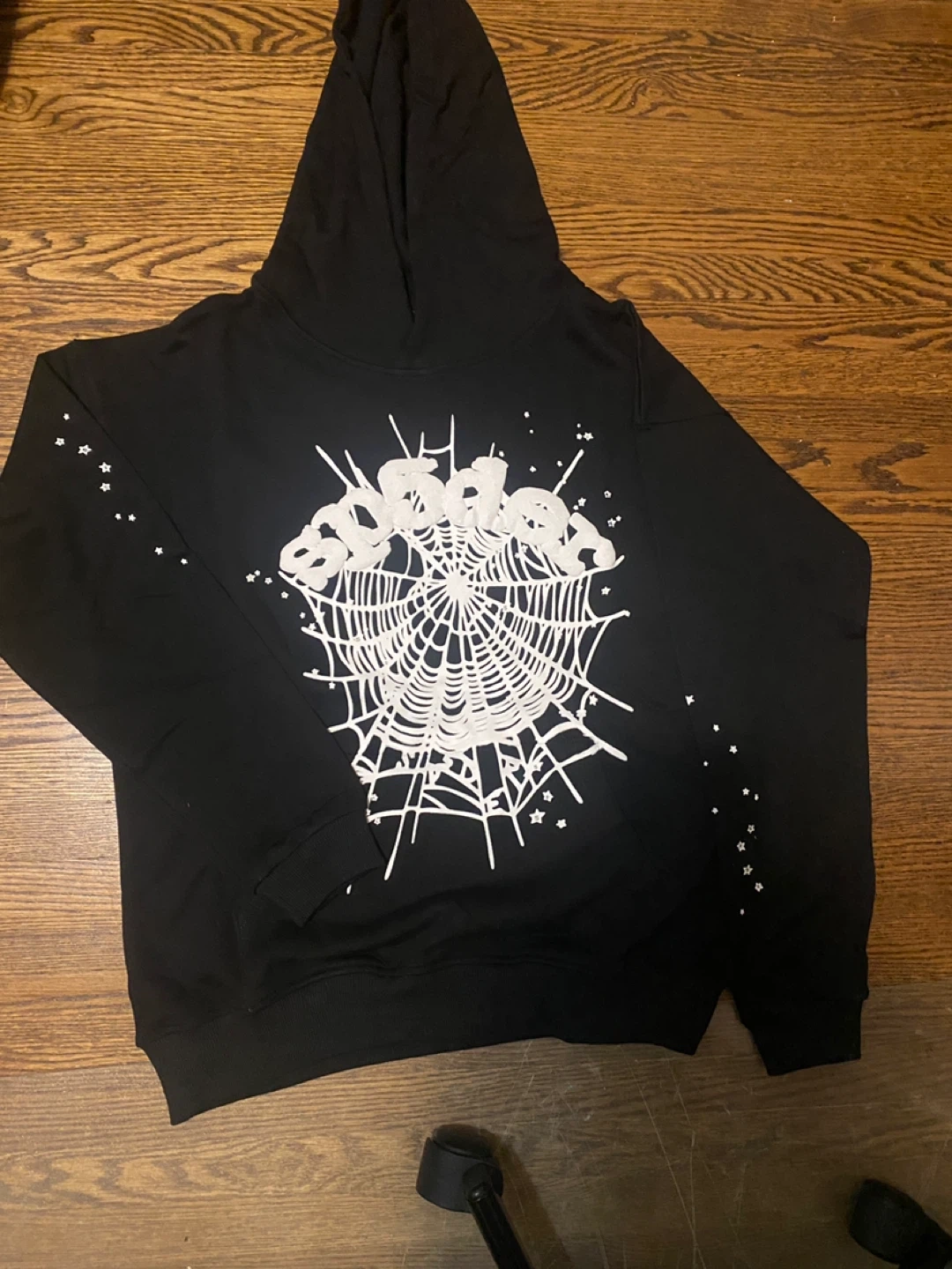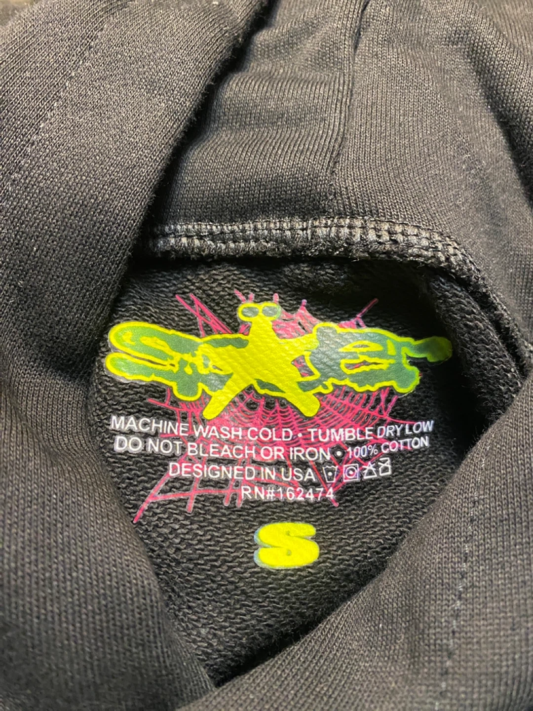 Selling a black Sp5der hoodie in size small. It features a unique spiderweb design on the front. The hoodie is made of 100% cotton and is designed in the USA. It's in great condition and ready for a new home!