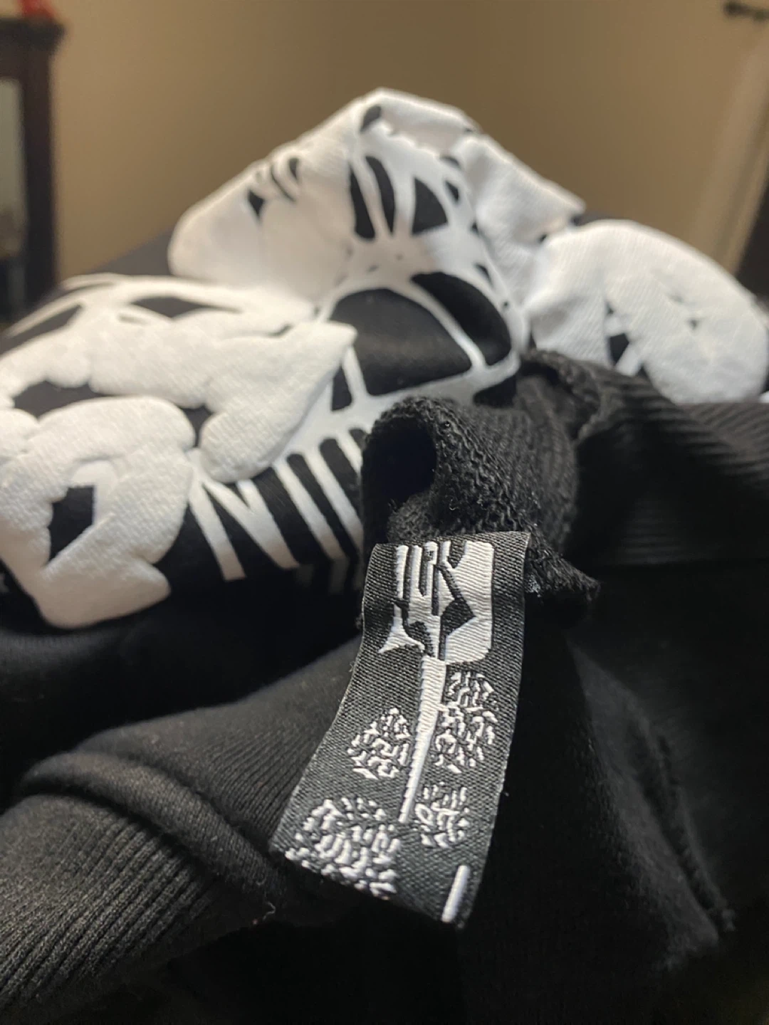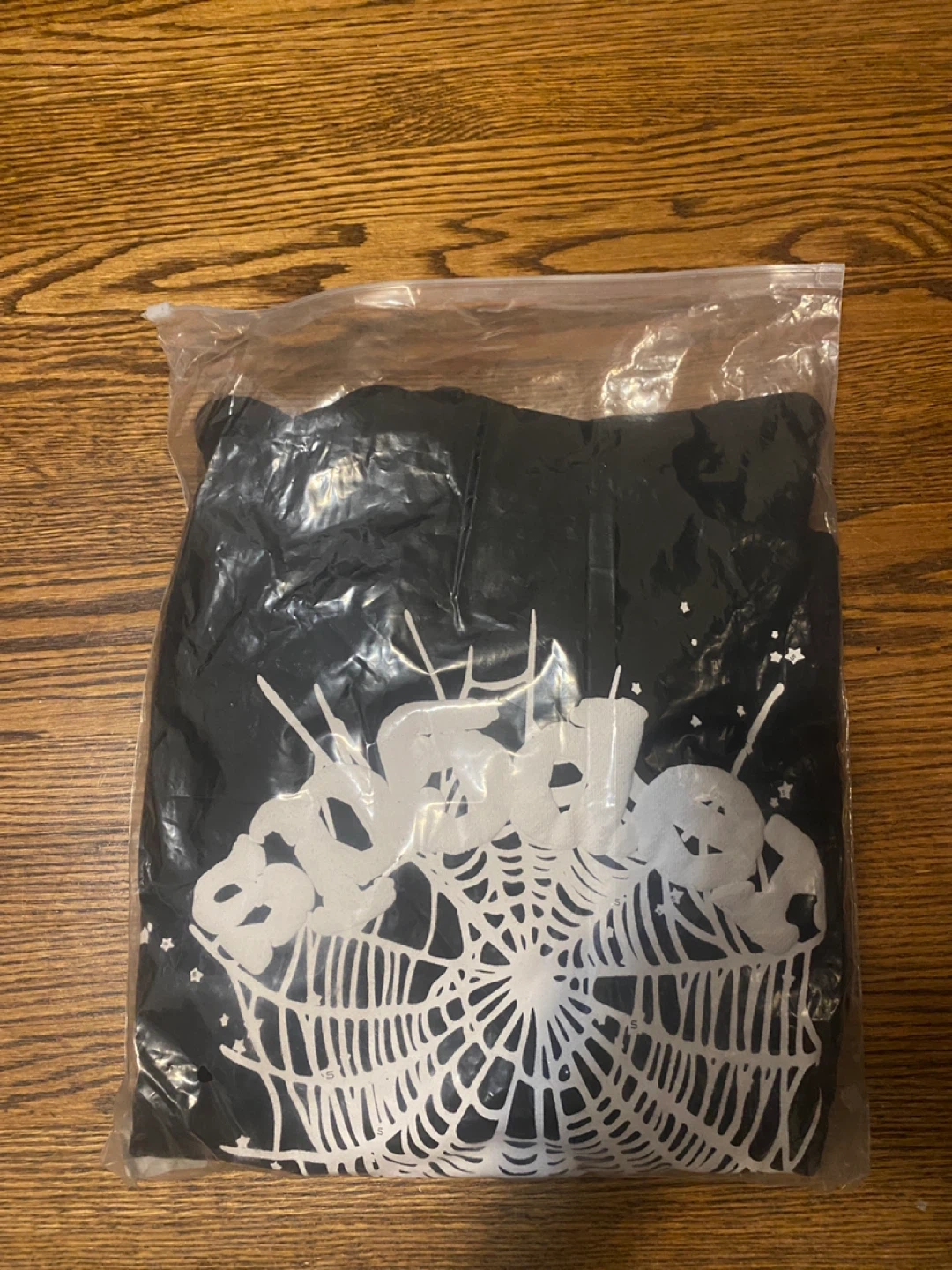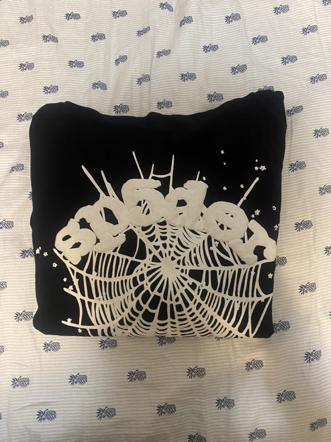 Selling a black Sp5der hoodie in size small. It features a unique spiderweb design on the front. The hoodie is made of 100% cotton and is designed in the USA. It's in great condition and ready for a new home!