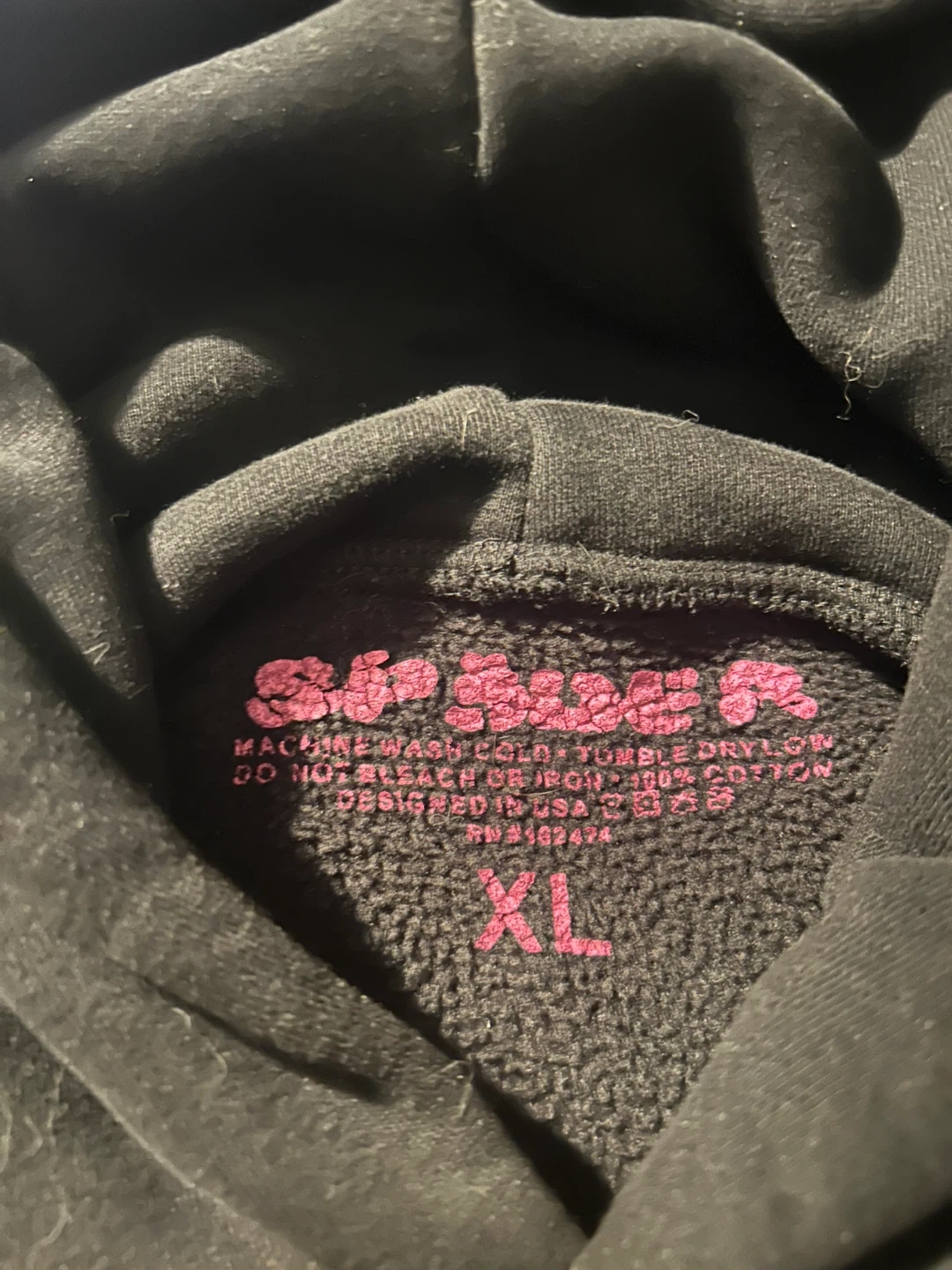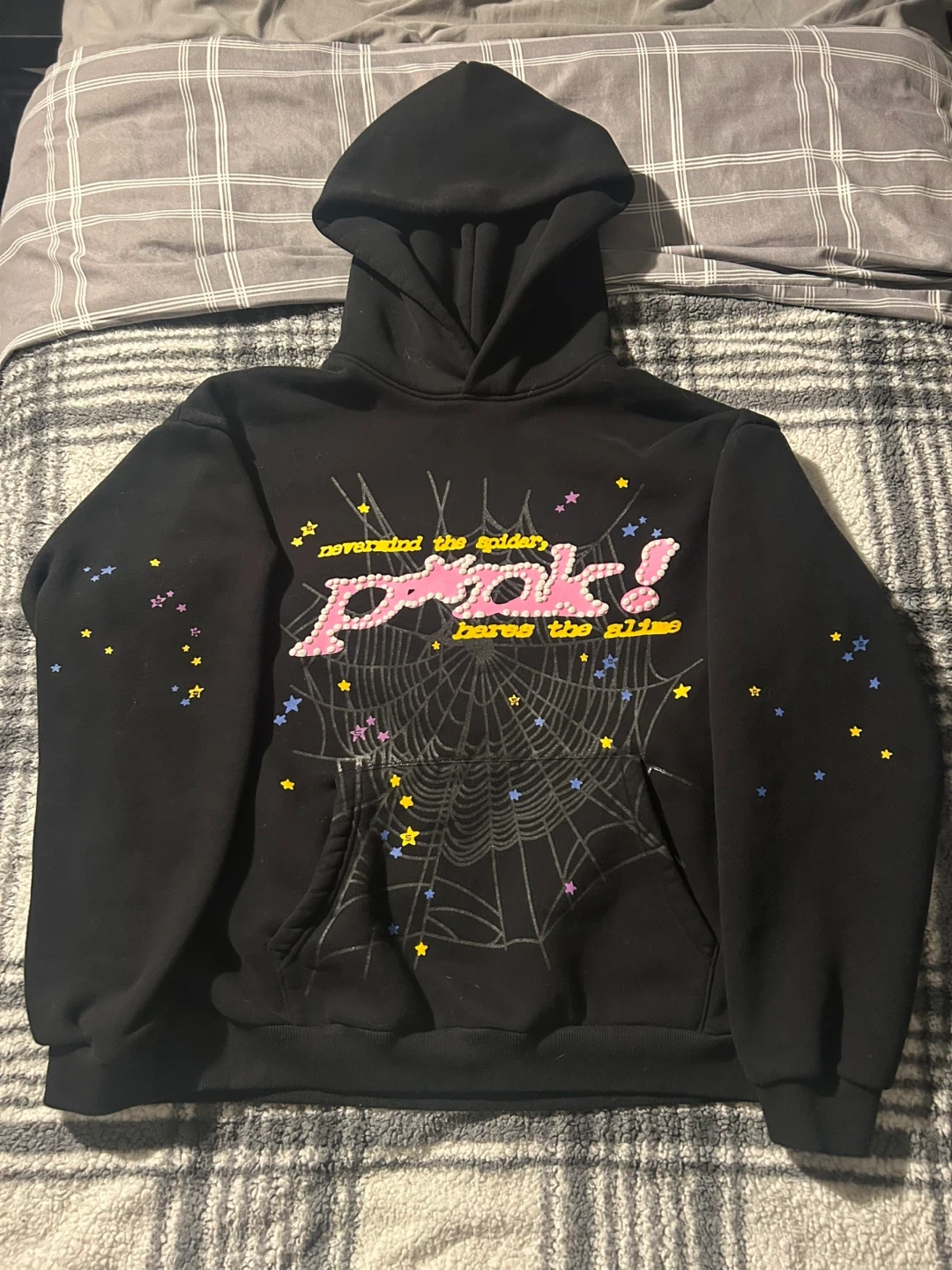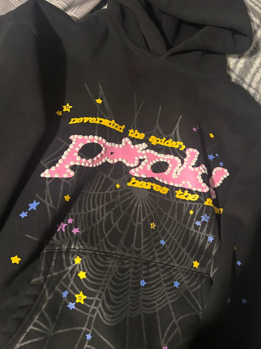 Selling a Sp5der black hoodie size XL but fits L. The hoodie features a unique spiderweb design with pink lettering and colourful stars. It's made of 100% cotton and is designed in the USA. Machine wash cold and tumble dry low.