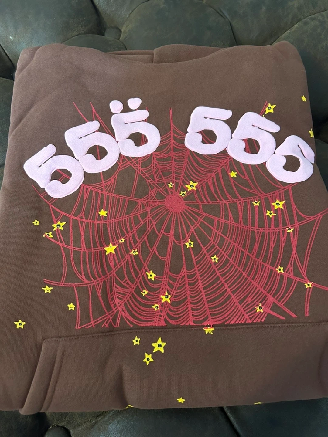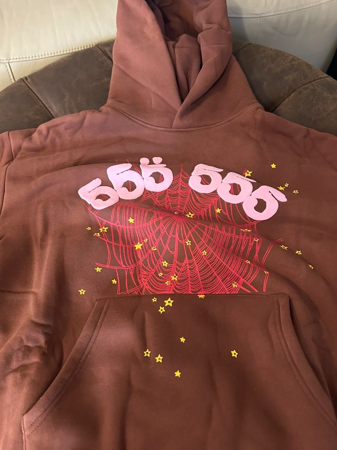 10Selling a brown Sp5der hoodie with a unique design! It features a spiderweb and the number '555' on the front. The hoodie is in great condition and perfect for adding a stylish touch to your wardrobe