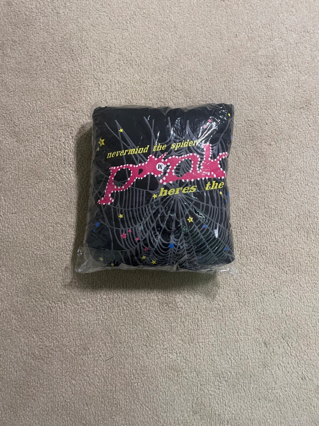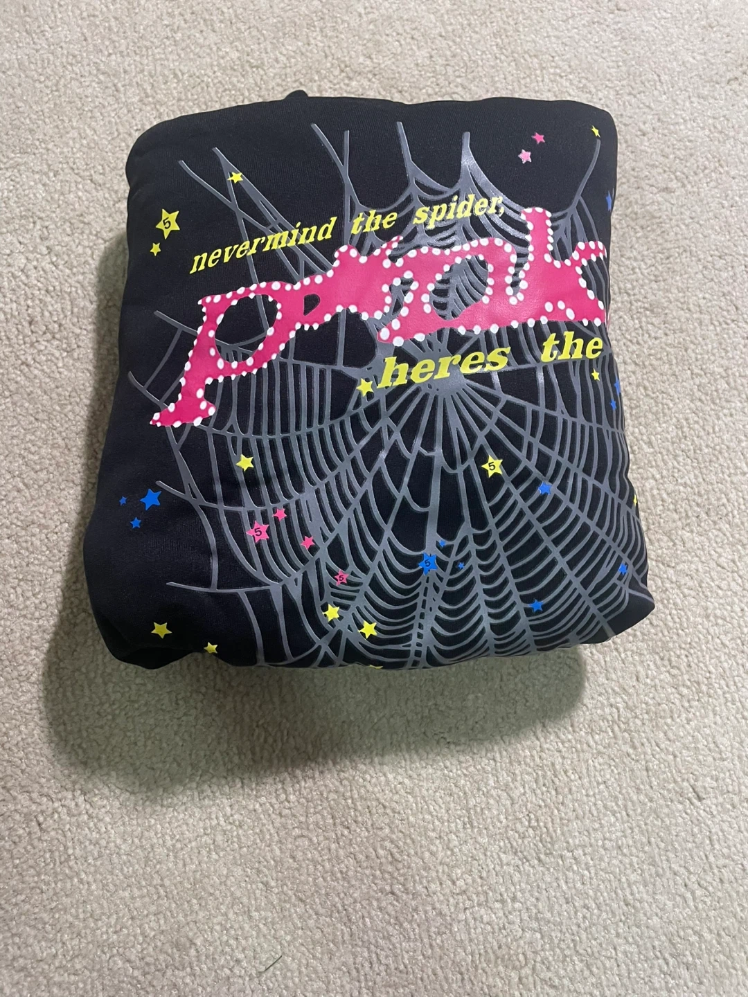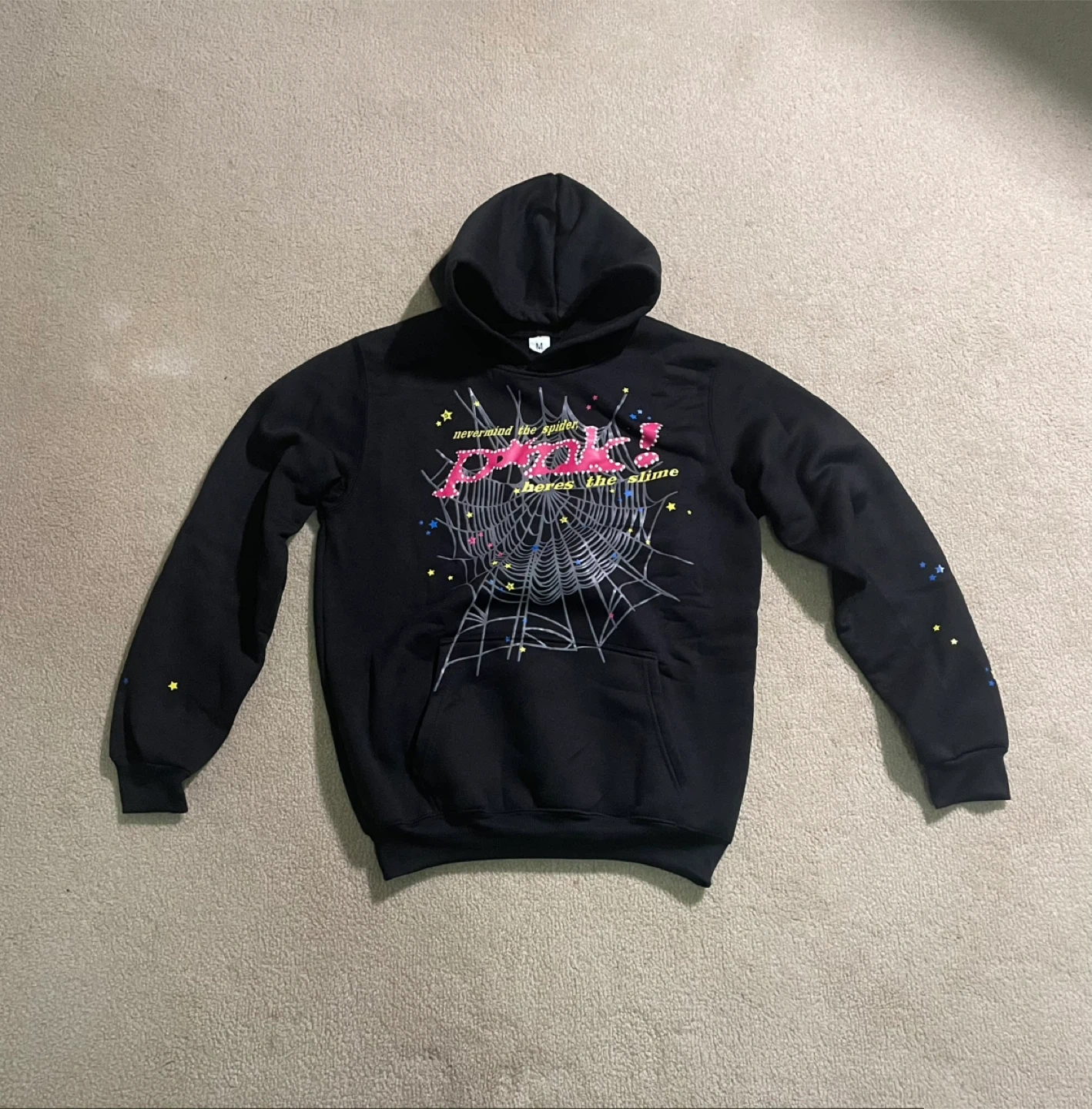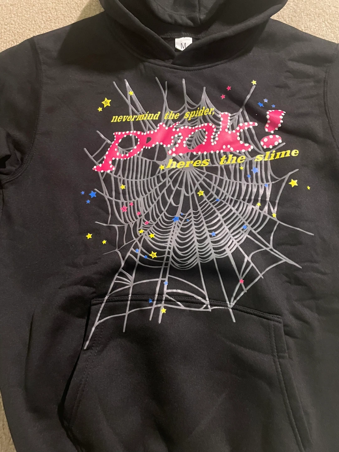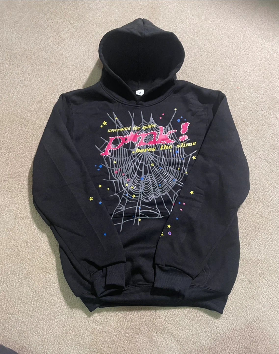 12Brand new Selling a Sp5der hoodie in black, size medium! The hoodie features a unique spiderweb design with colorful accents. It's in great condition and ready for a new home