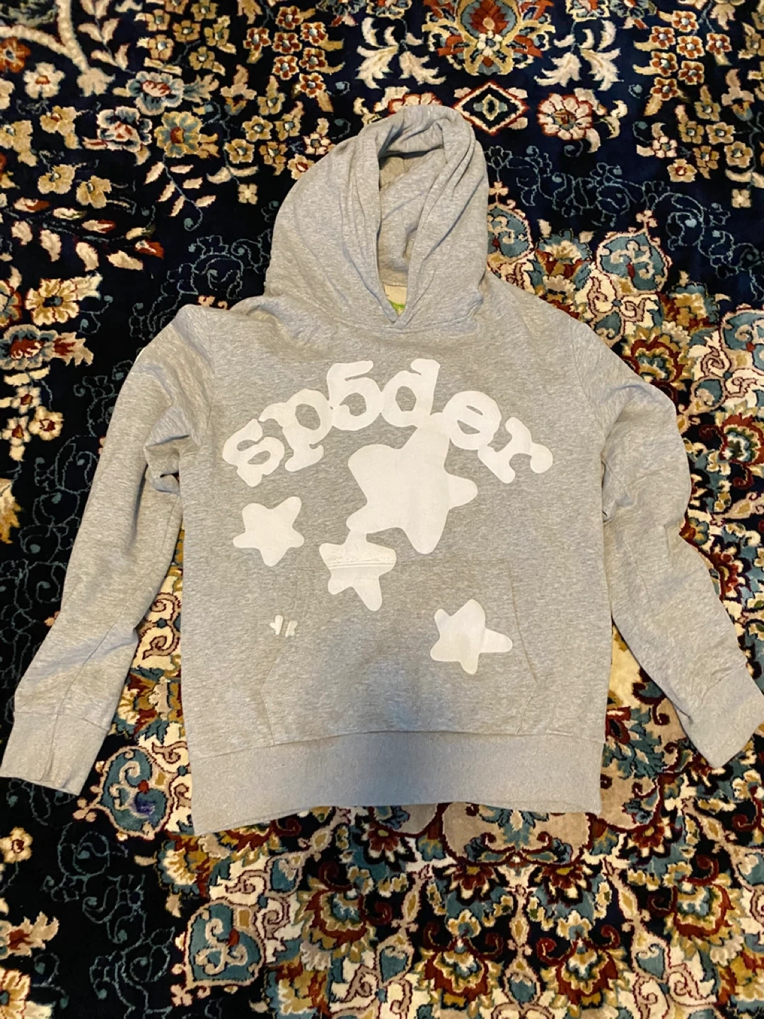 10Selling a Sp5der hoodie in size small. It's grey and made of 100% cotton. The design features a spider graphic. It's in great condition and ready for a new home!