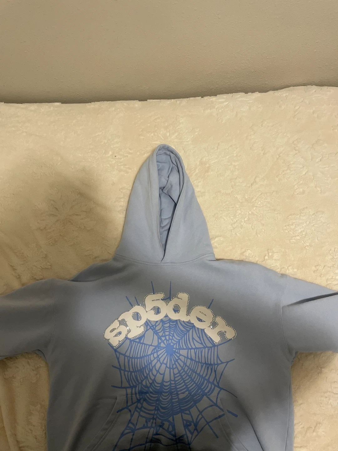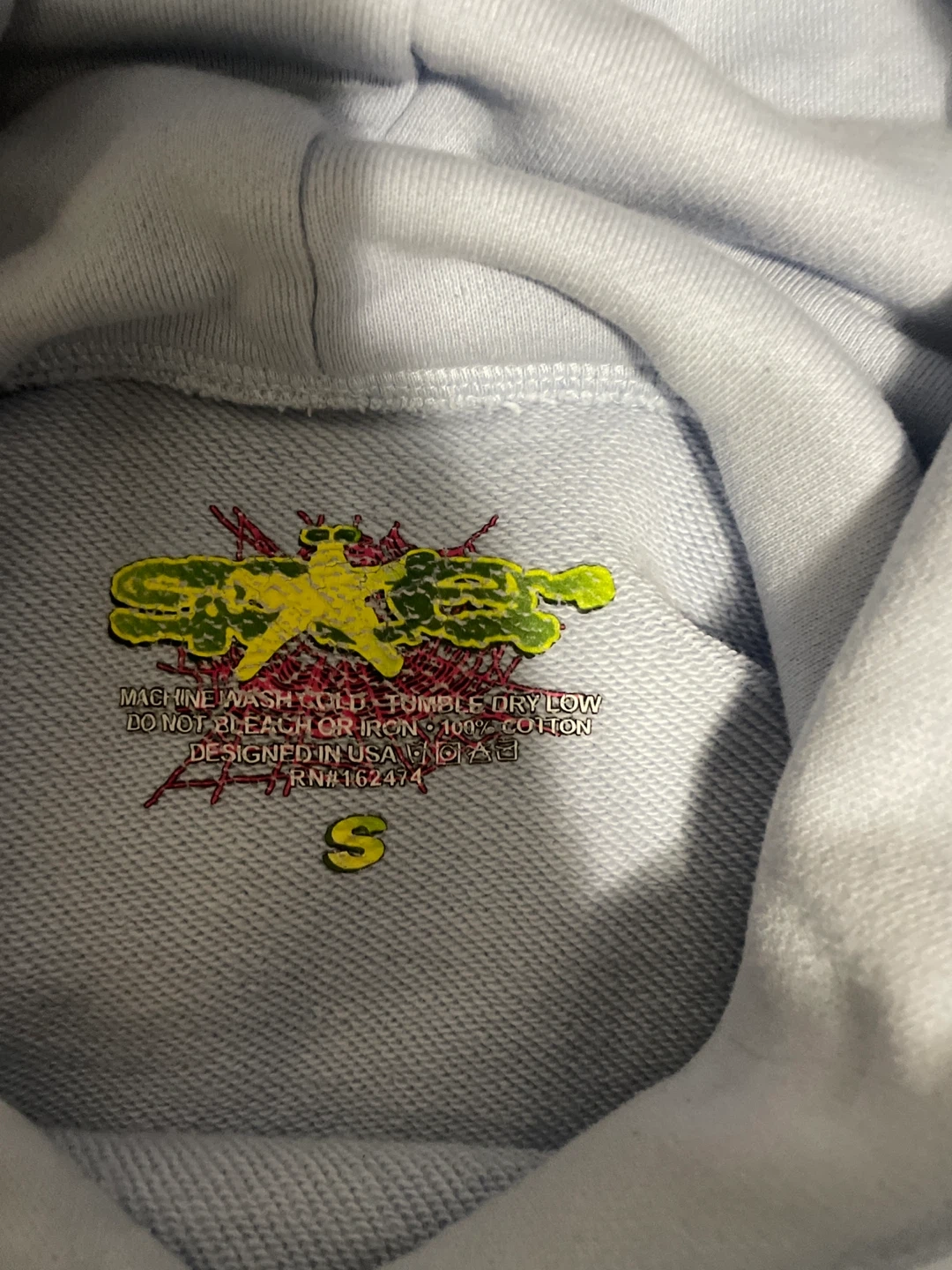 10Selling a Sp5der hoodie in size small. It features a spiderweb design on the front. The material is 100% cotton. It's in great condition! Fallen off rhinestones