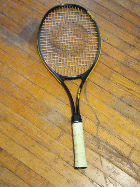 Selling a used tennis racquet. The strings look a bit worn, but the grip is in decent shape