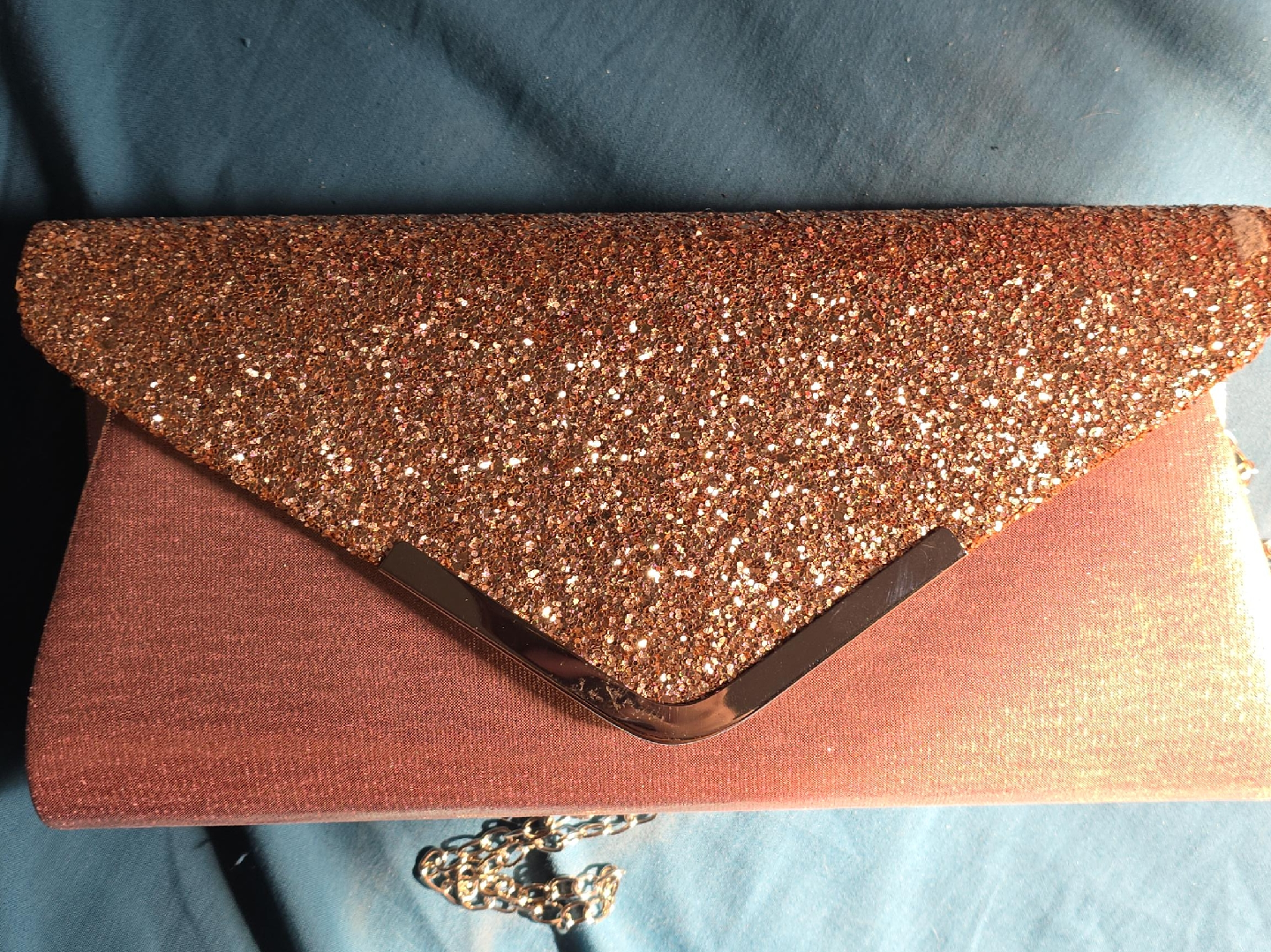 Selling a sparkly rose gold clutch purse! It's in great condition and perfect for a night out or special event. It has a chain strap and a magnetic closure. The inside is a light pink colour with a small pocket