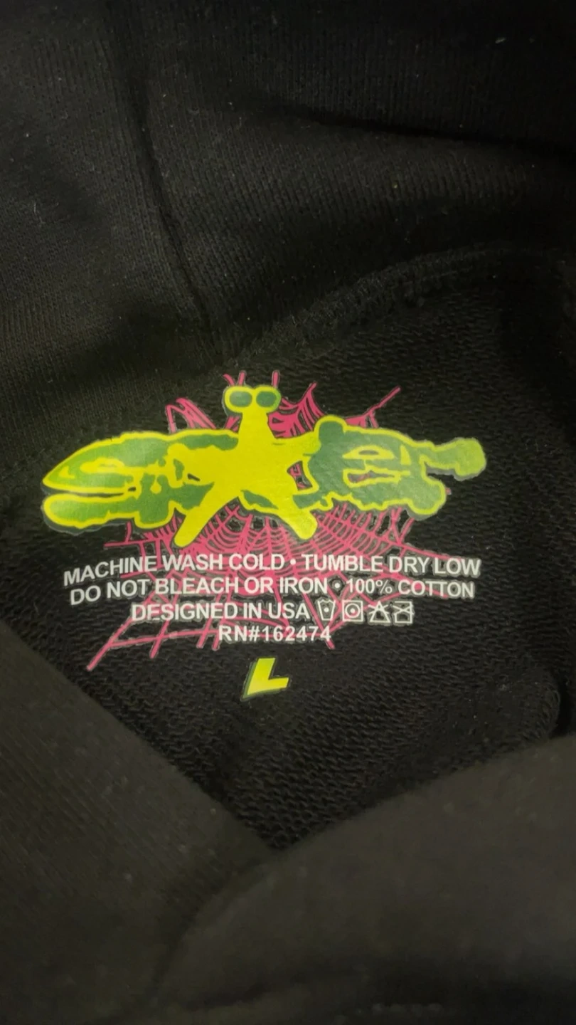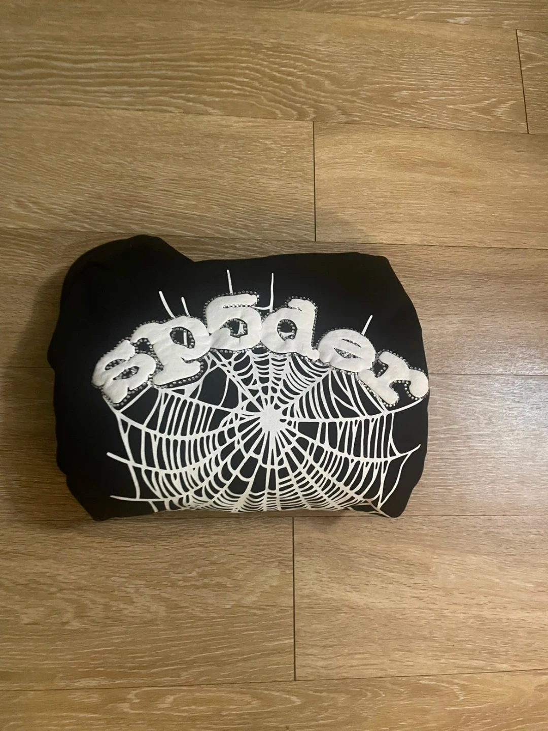 This black SPIDER hoodie features a large spiderweb graphic on the front. It's made of 100% cotton and designed in the USA. Size is large. Is a 1.1