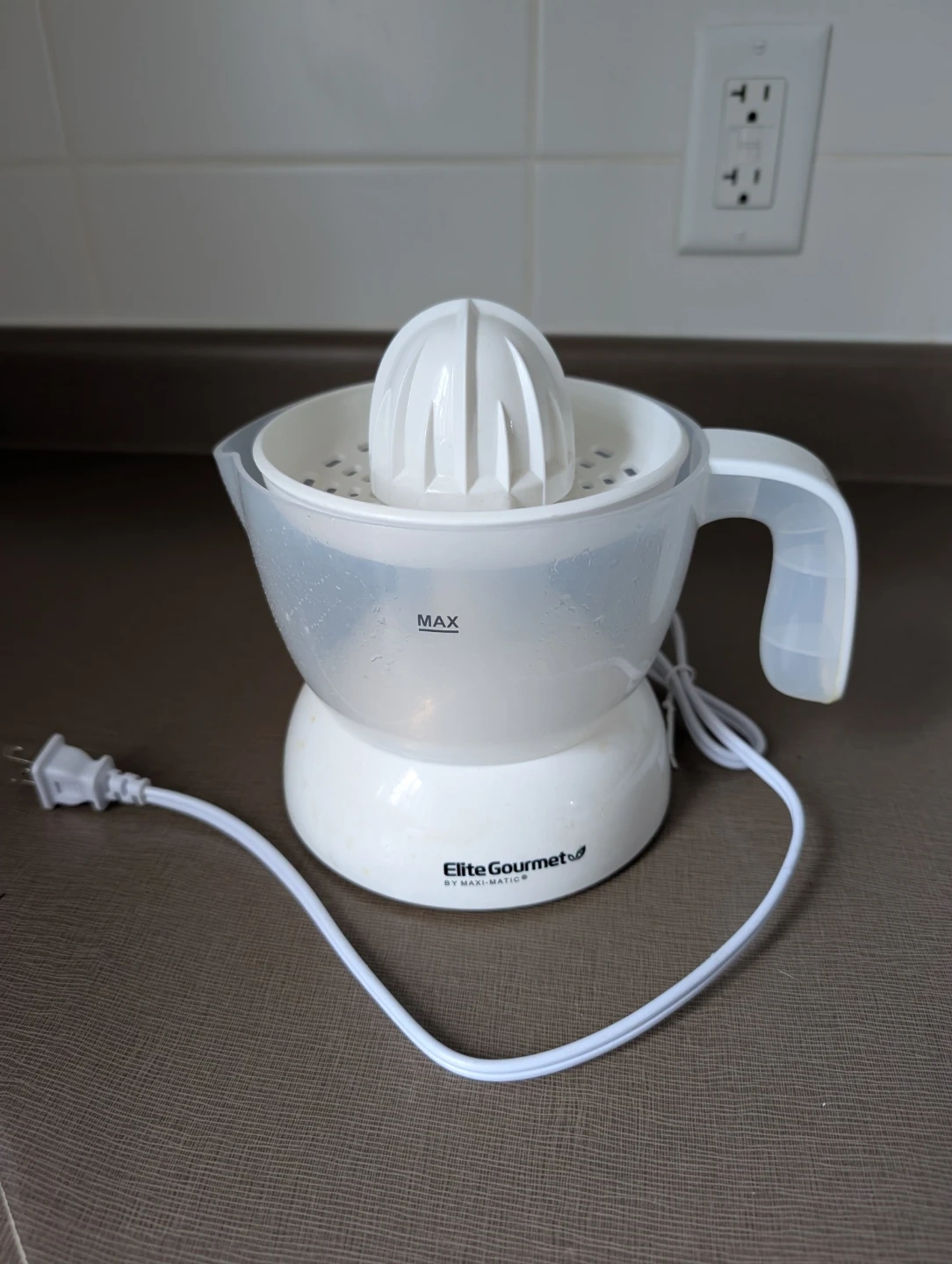 White electric citrus juicer by Elite Gourmet. It's got a detachable pitcher and comes with a reamer and strainer. Max fill line is visible on the pitcher.