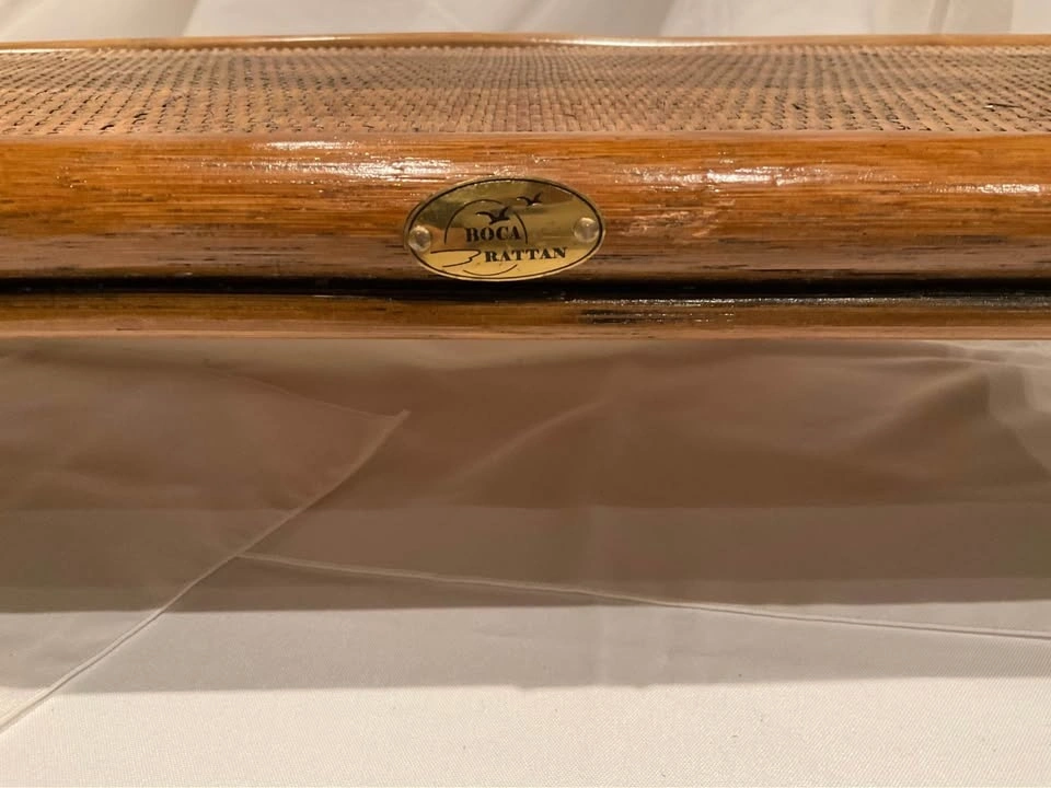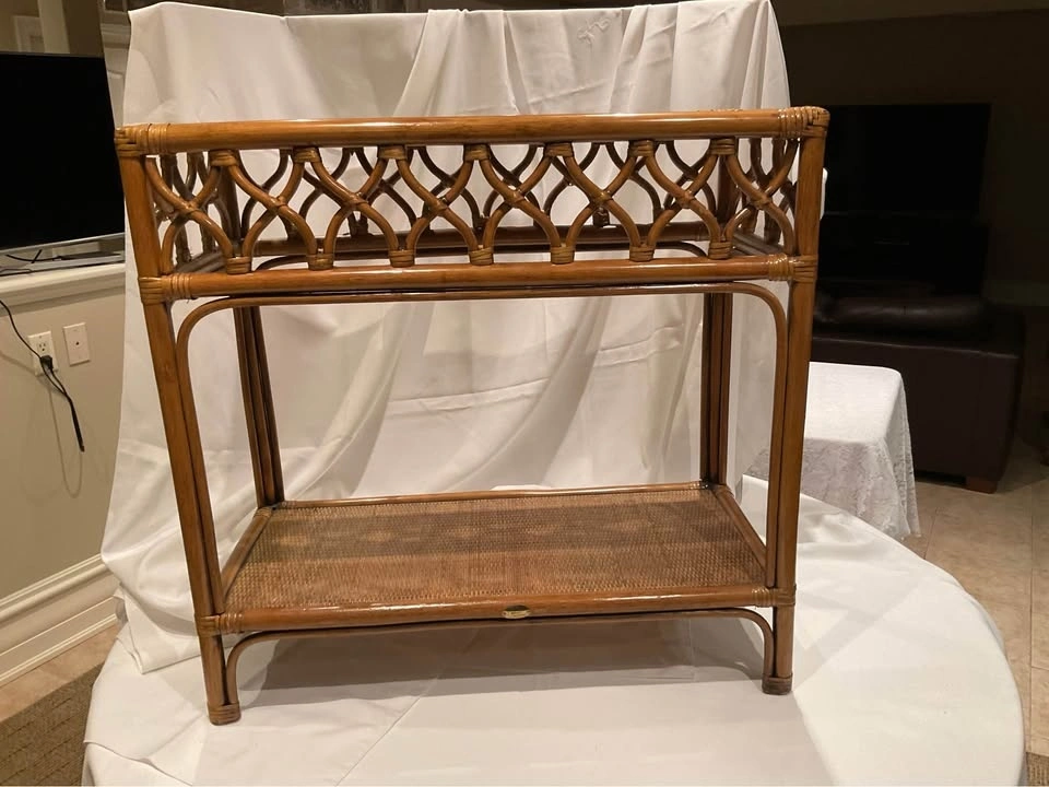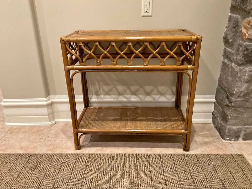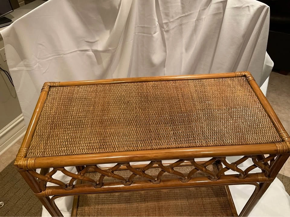 Stunning woven details in bamboo & cane. Solid, heavy piece with handwoven top and bottom shelf. Excellent quality craftsmanship in pristine condition. Height 29", Width 30". From a smoke & pet-free home. Located in Richmond Hill near Bathurst & King Rd. Cash only.