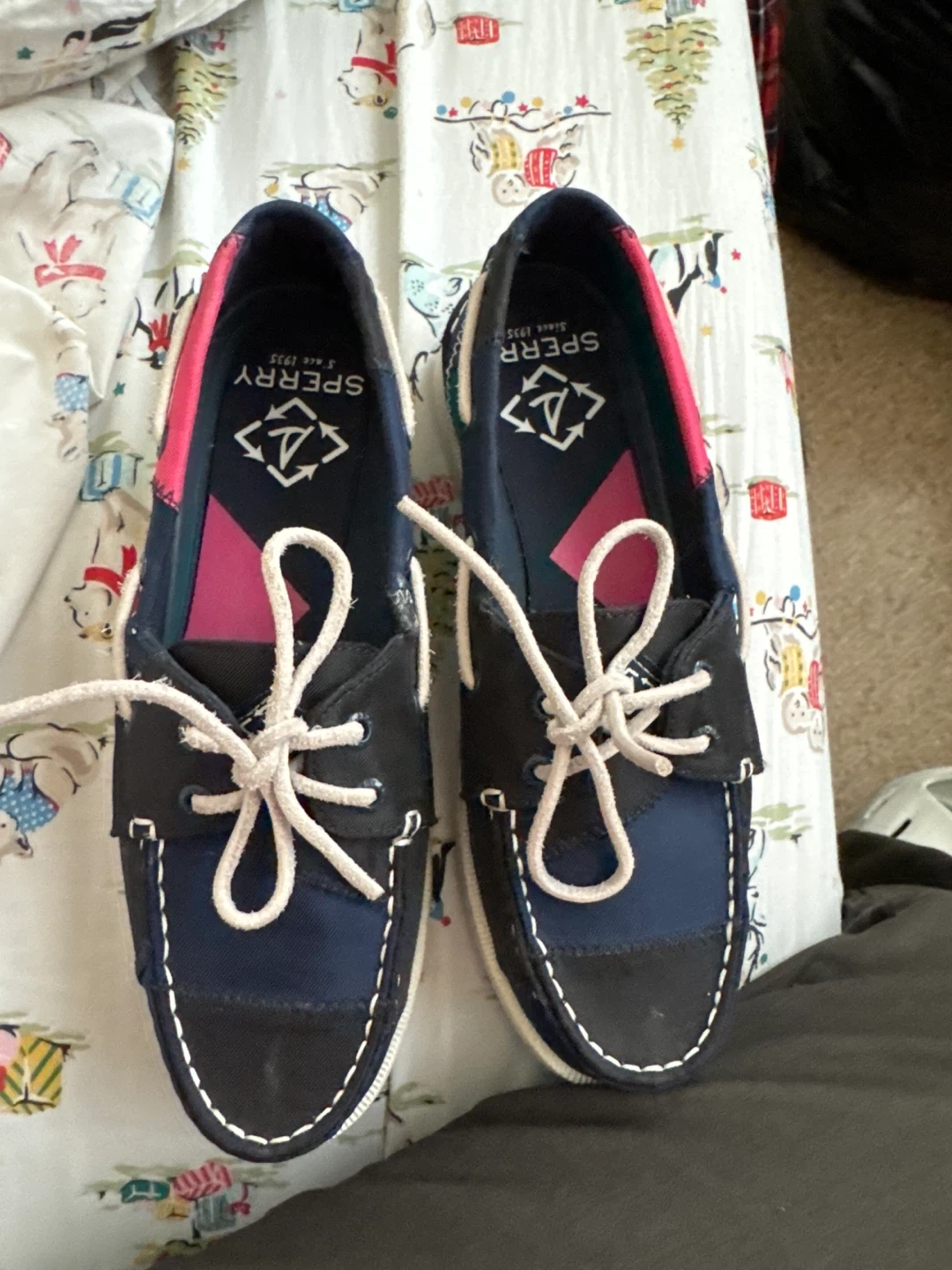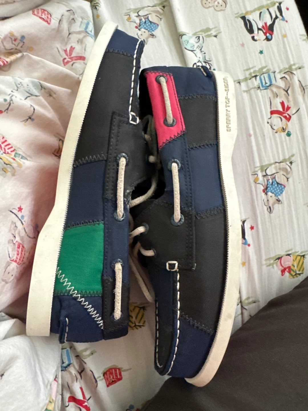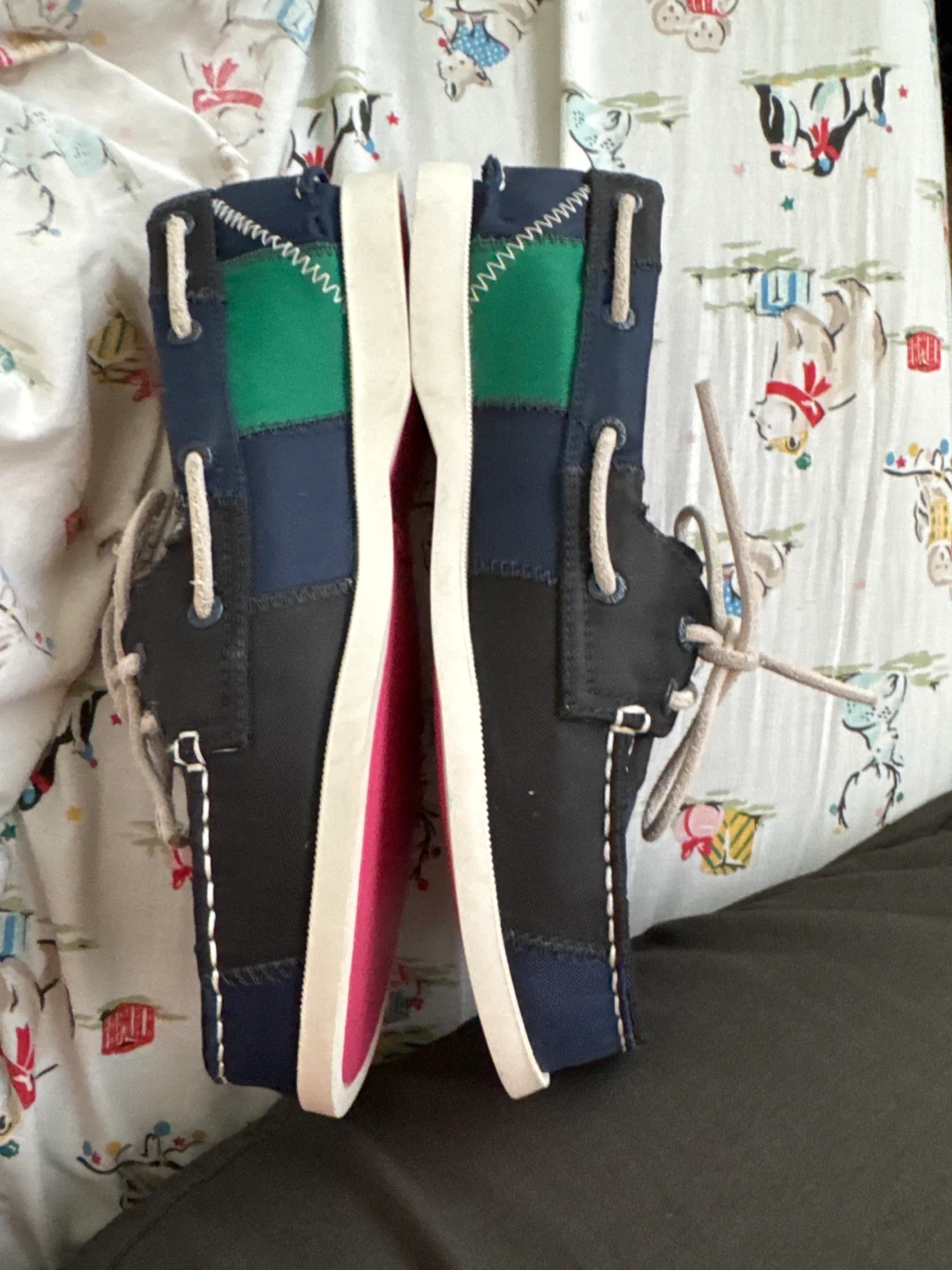 Selling a pair of Sperry Top-Sider boat shoes! They feature a unique patchwork design with navy, black, and green accents. The insoles are a vibrant pink. Great for casual wear!