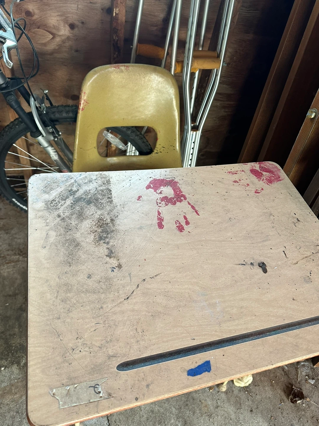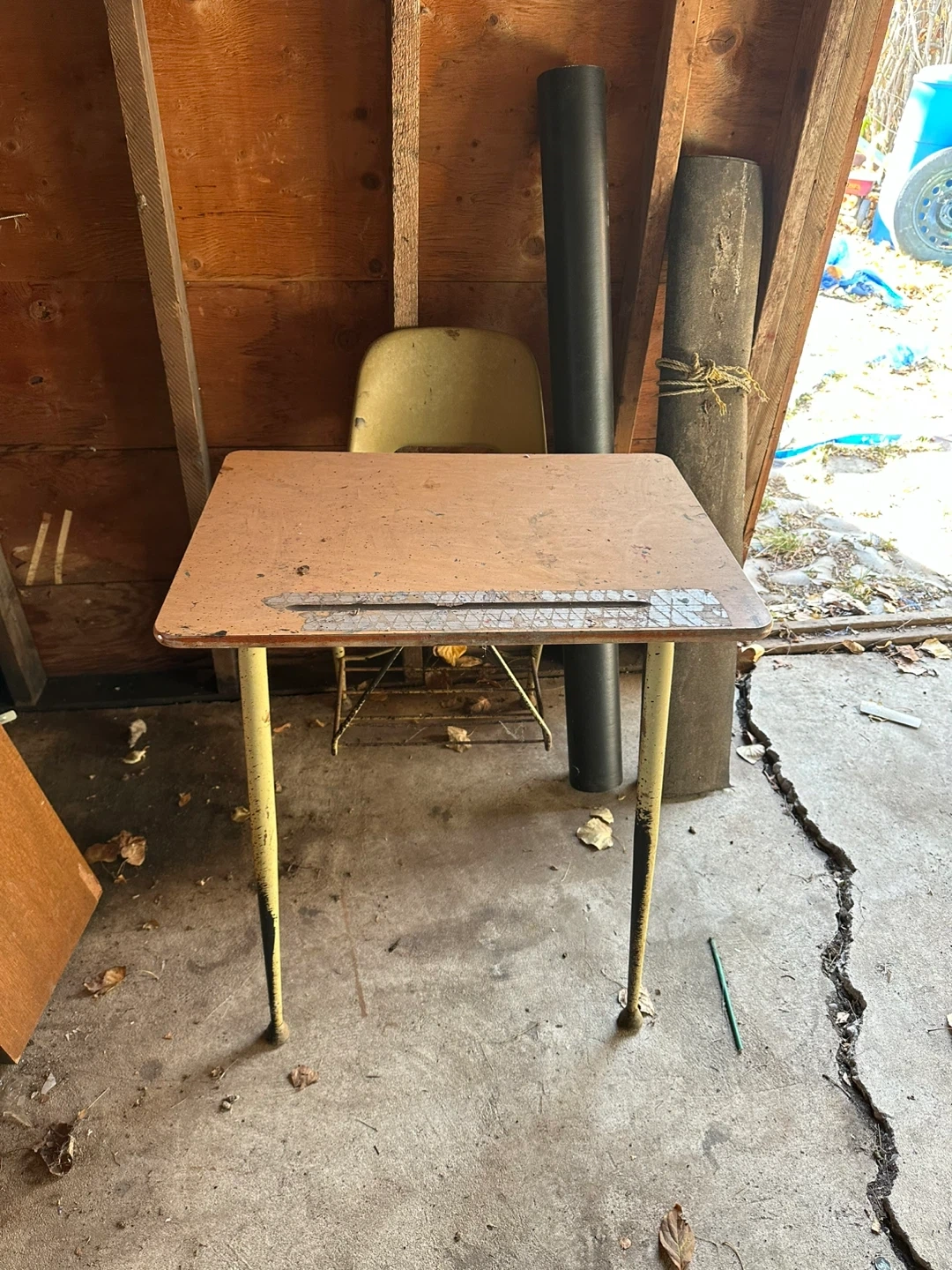 This is a vintage child's school desk and chair set. It features a wooden desktop with a metal frame and legs. The chair has a yellow plastic seat and back. It's seen some use, perfect for a craft project or upcycling!
