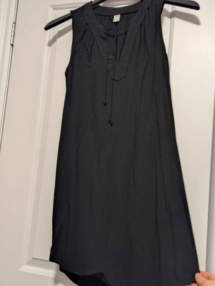 Classic and versatile sleeveless shift dress from Old Navy in solid black. Made from lightweight 100% rayon/viscose for a soft, flowy feel. Features a V-neckline with a subtle tie detail and a relaxed, easy-to-wear silhouette—perfect for layering or wearing on its own for casual or dressy occasions.