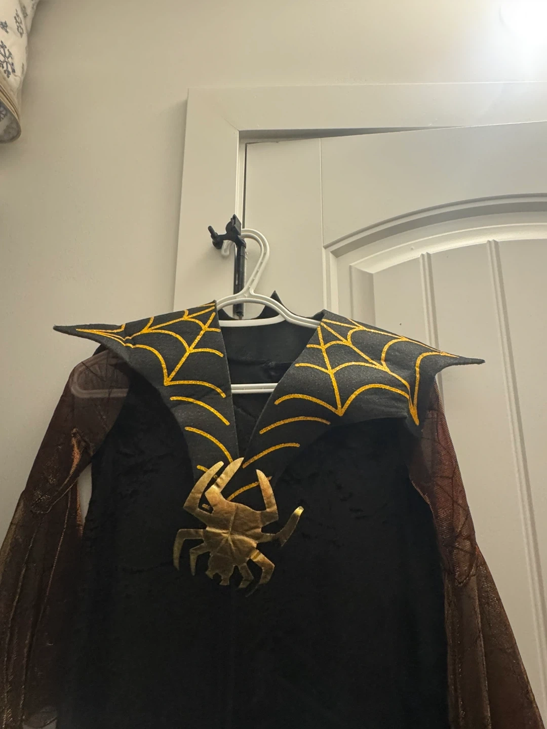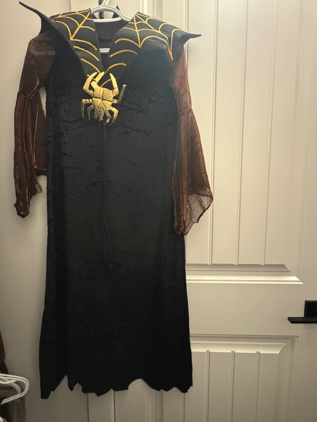 12Selling a gently used spider Halloween costume. It features a black velvet-like material with gold spiderweb detailing on the collar and a large gold spider embellishment. The sleeves are a sheer, brown mesh. Perfect for Halloween!