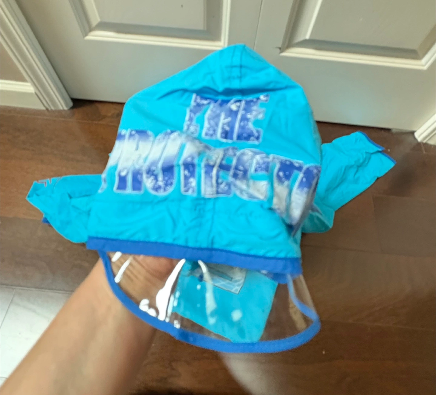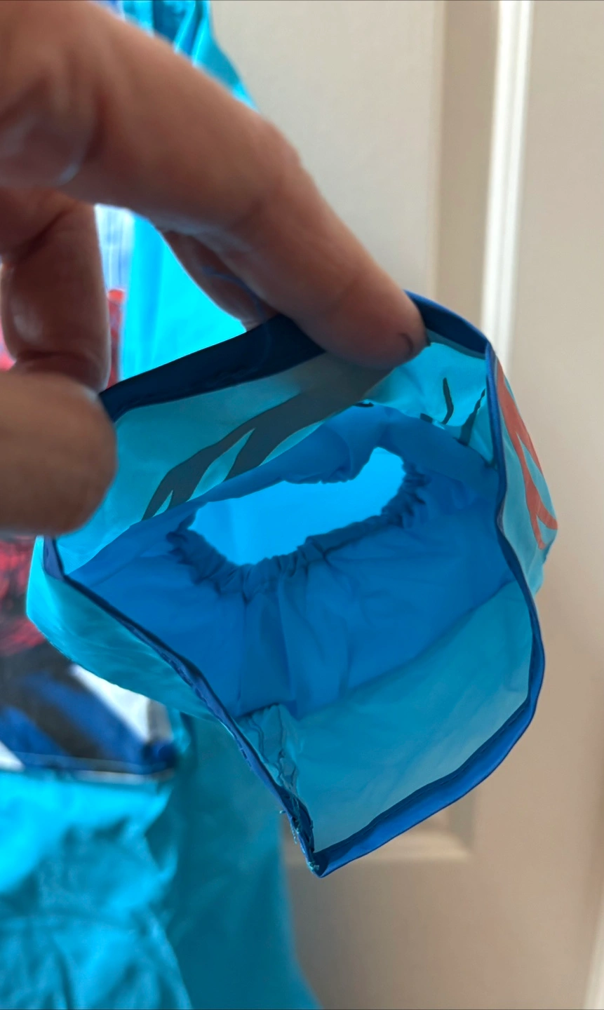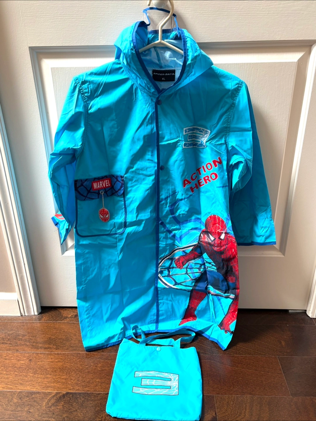 Keep your little superhero dry with this awesome Spider-Man rain jacket! It's a vibrant blue and features a cool Spider-Man design. Size is XL Armpit to armpit 19โ across 31โ long Expanding back to cover your backpack ๐ inside . Elastic inside cuff . Well covered hoodie . Comes in original pouch , brand new with tag .
