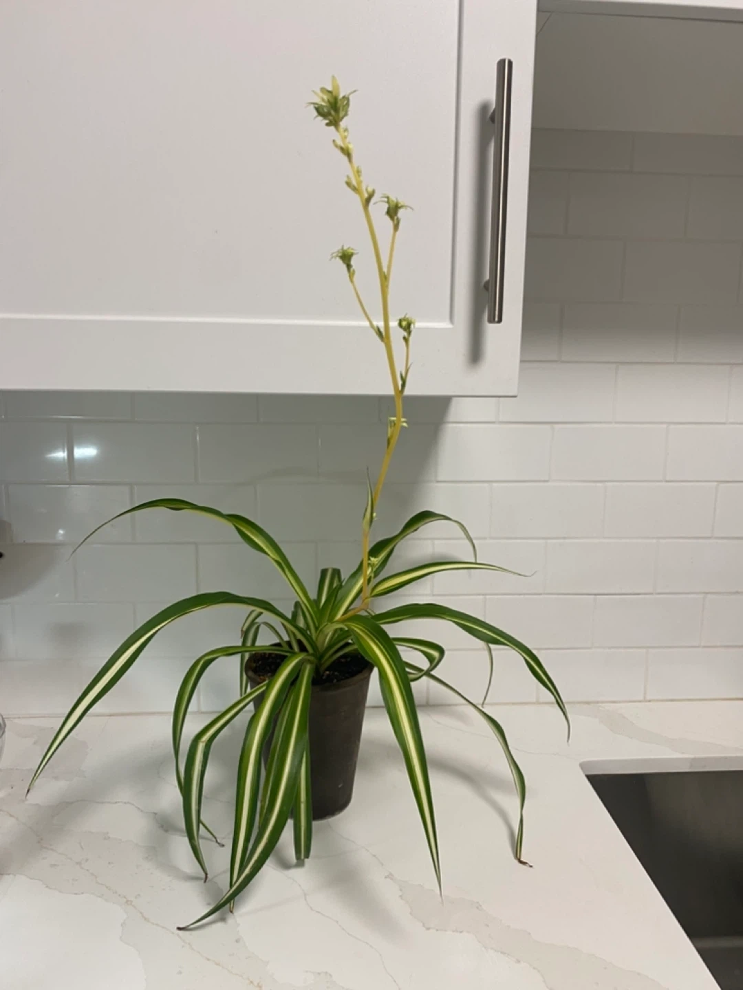 A healthy spider plant ready for a new home! This plant is known for being easy to care for and great at purifying the air. It's currently in a pot and has even started to flower. Perfect for adding a touch of green to any space