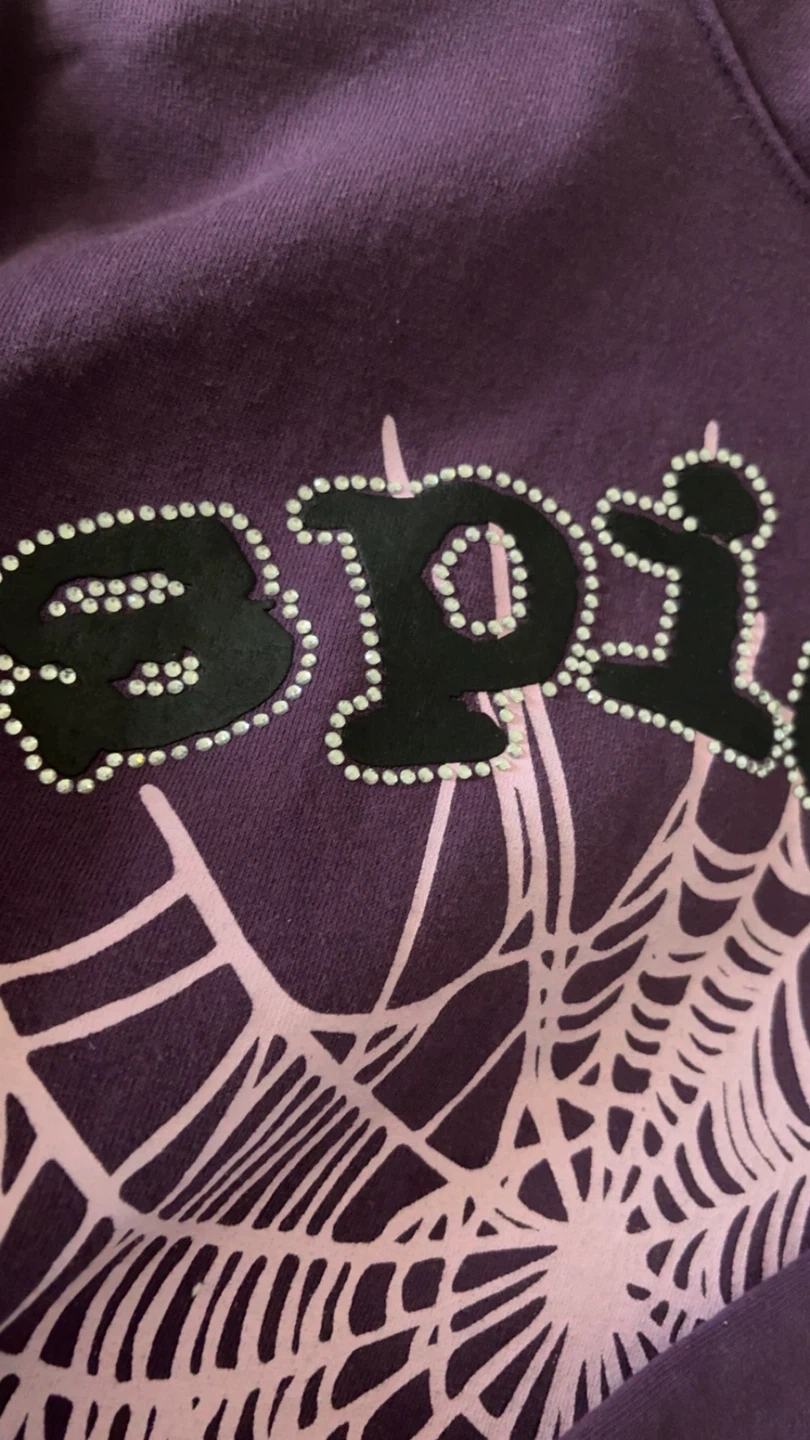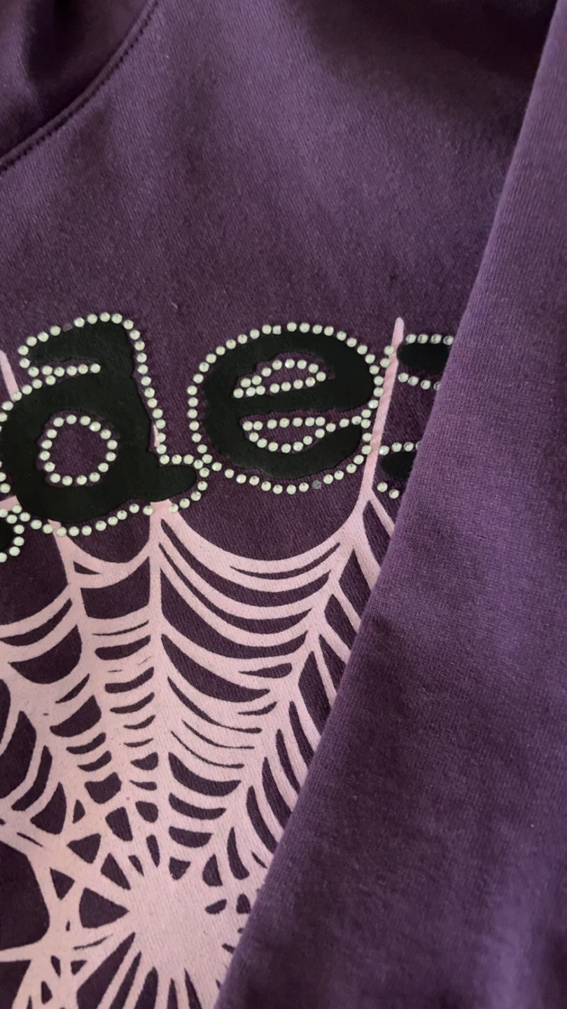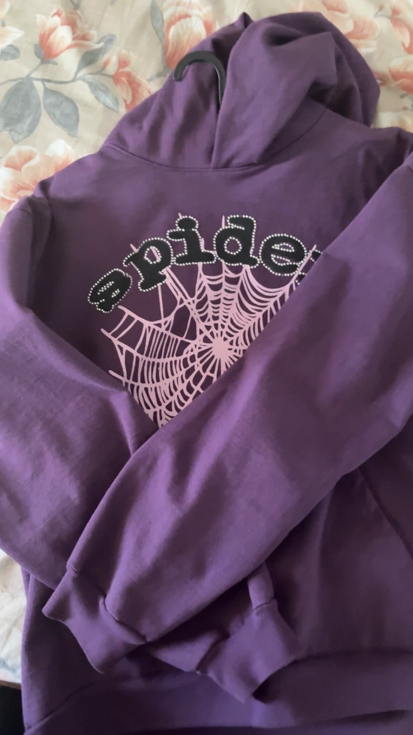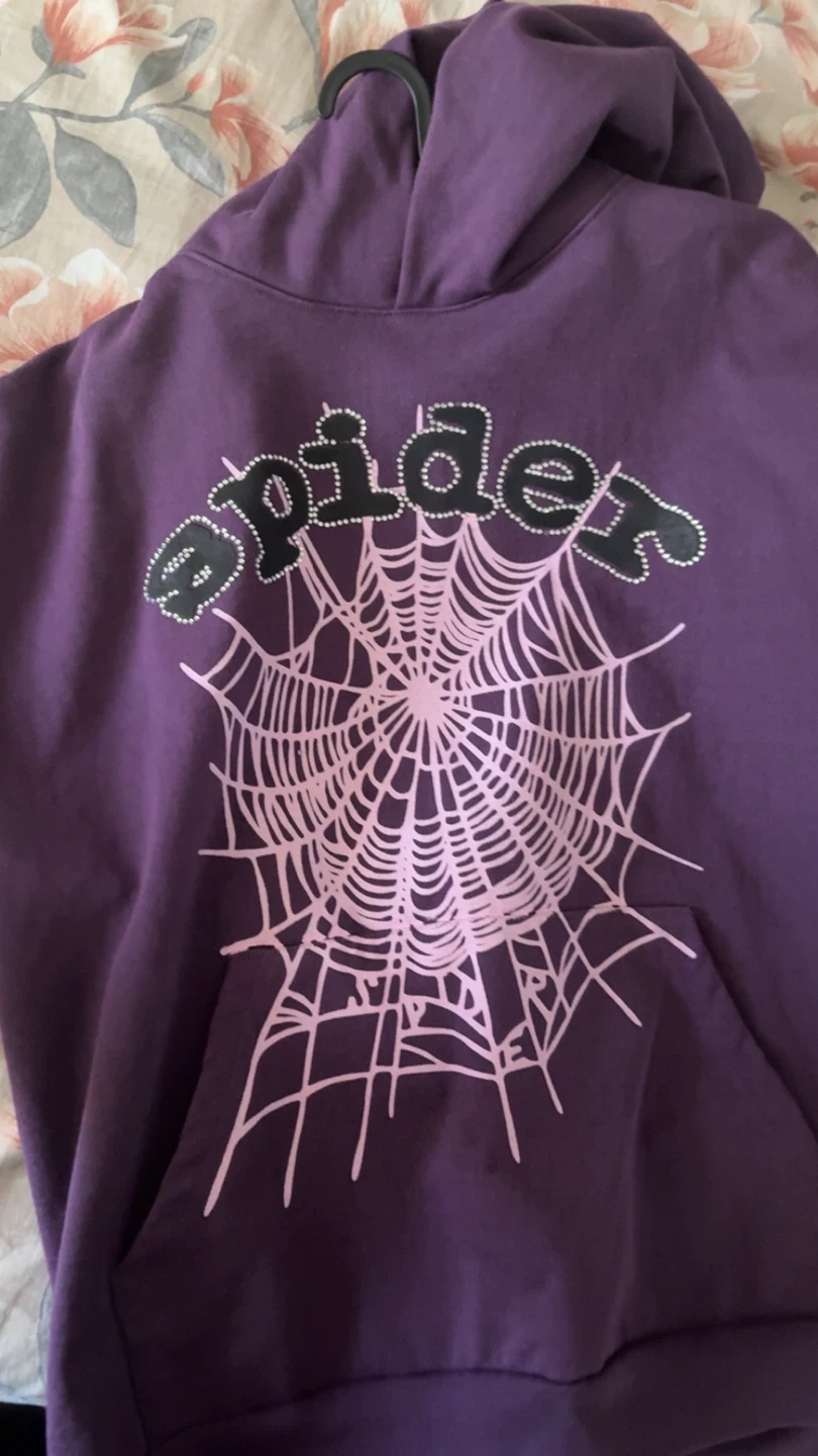 Selling a purple Spider hoodie! It features a large spiderweb design on the front. The word "spider" is written above the web in a stylized font. It has a cozy, fleece-like interior. Perfect for staying warm and stylish!