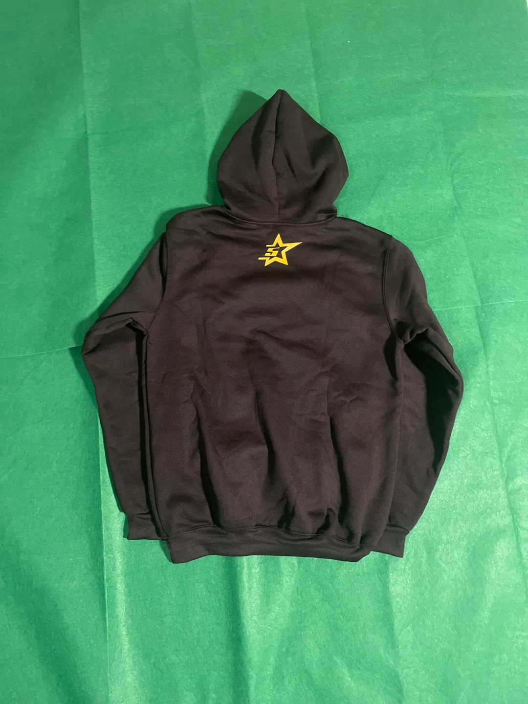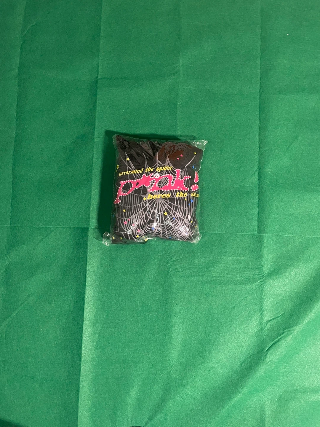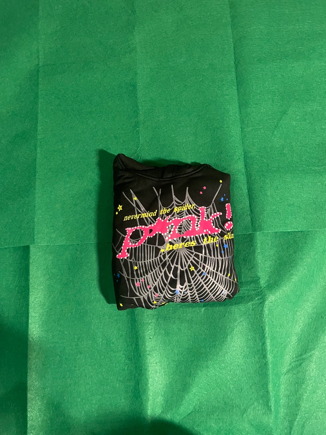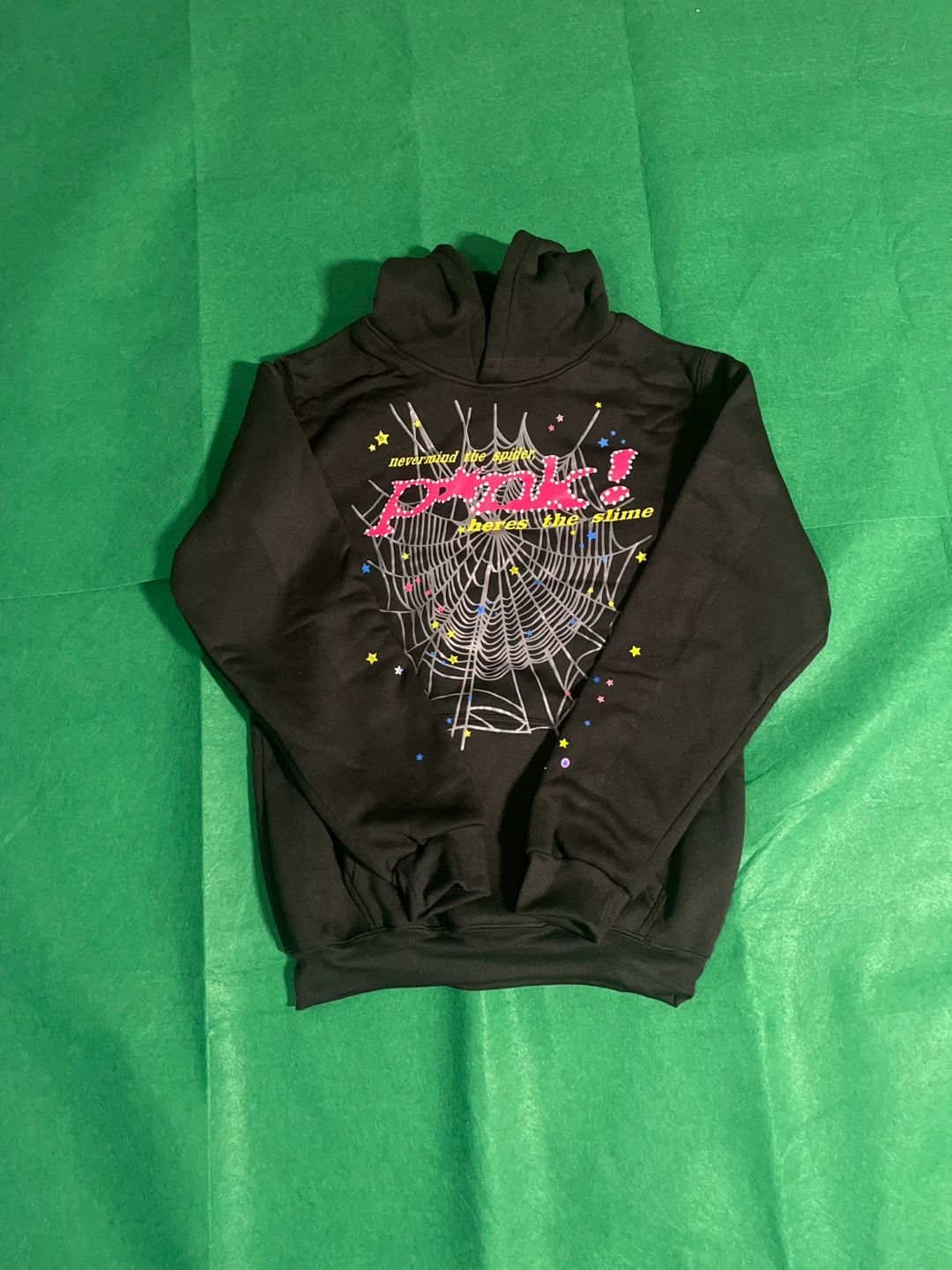 12BRAND NEW !!! Size M I'm selling a black Spider Worldwide hoodie with a unique spiderweb design! It's in great condition and ready for a new home. The hoodie features the text 'nevermind the spider, here's the slime' and a star logo on the back. Perfect for adding a touch of streetwear to your wardrobe!