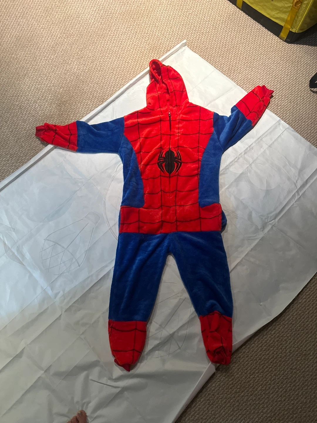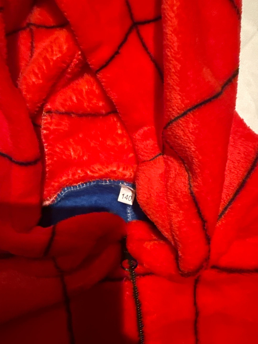 18Selling a cozy Spiderman fleece onesie! It's in great condition and perfect for keeping your little one warm. The size is 140, so it would fit a child around that height. It features the classic Spiderman design in red and blue fleece.