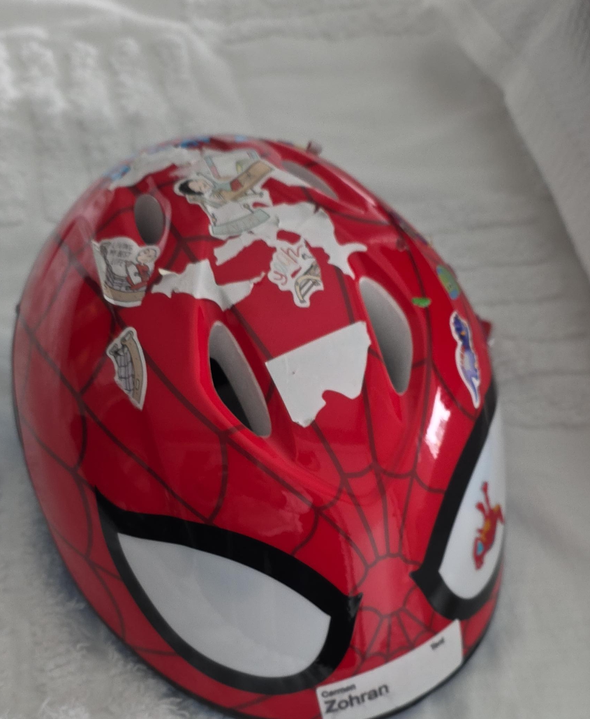 65Selling a Spiderman-themed kids' helmet. It's red and white, and has some fun stickers on it. Perfect for keeping your little one safe while they're biking or scootering!