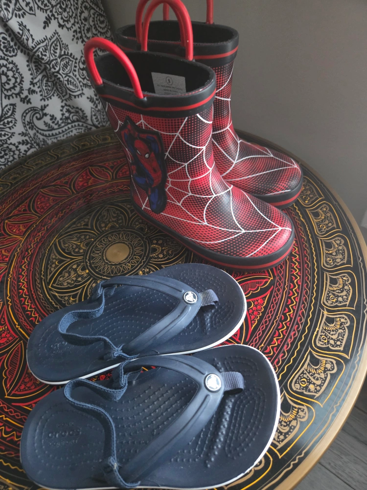 65Selling a pair of Spiderman rain boots and Crocs flip flops. The rain boots feature a fun Spiderman design, and the Crocs are a comfy navy blue. Perfect for your little one!