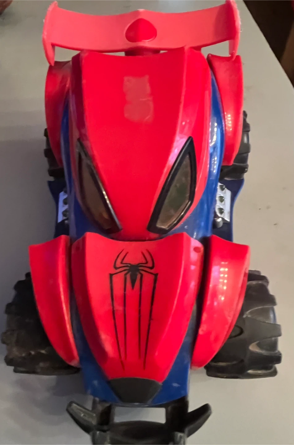 58Selling a Spiderman-themed RC car! It's red and blue, with a Spiderman logo on the front. It has large tires and a spoiler. There are some signs of use, but it's still in good working condition! NO Remote.
