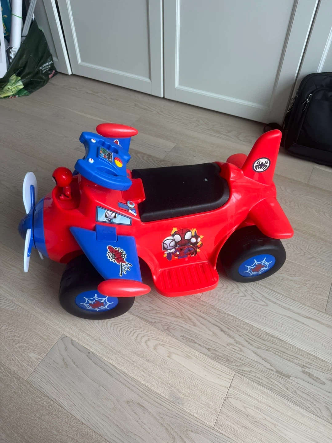 10Selling a cute Spiderman-themed ride-on airplane toy! It's in great condition and ready for a new little pilot. Perfect for indoor or outdoor fun! Comes with charger