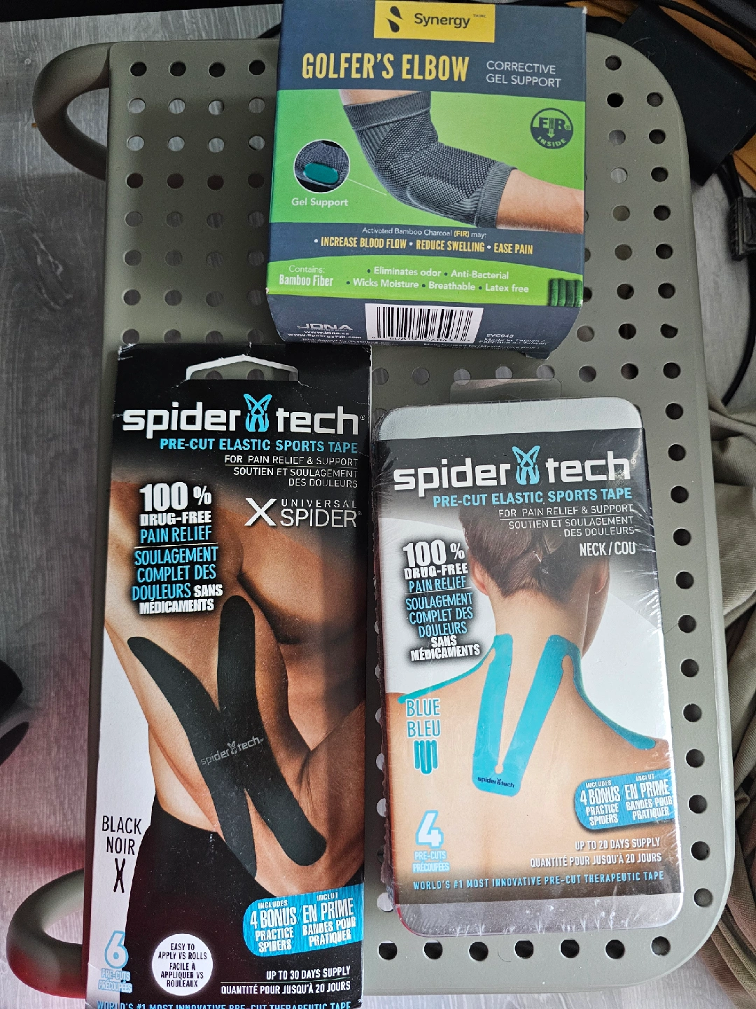 Get a bundle of pain relief items! Includes: - Synergy Golfer's Elbow Corrective Gel Support: Designed to increase blood flow, reduce swelling, and ease pain, using activated bamboo charcoal - SpiderTech Pre-Cut Elastic Sports Tape (Black & Blue): 100% drug-free pain relief, easy to apply, and includes bonus practice spiders
