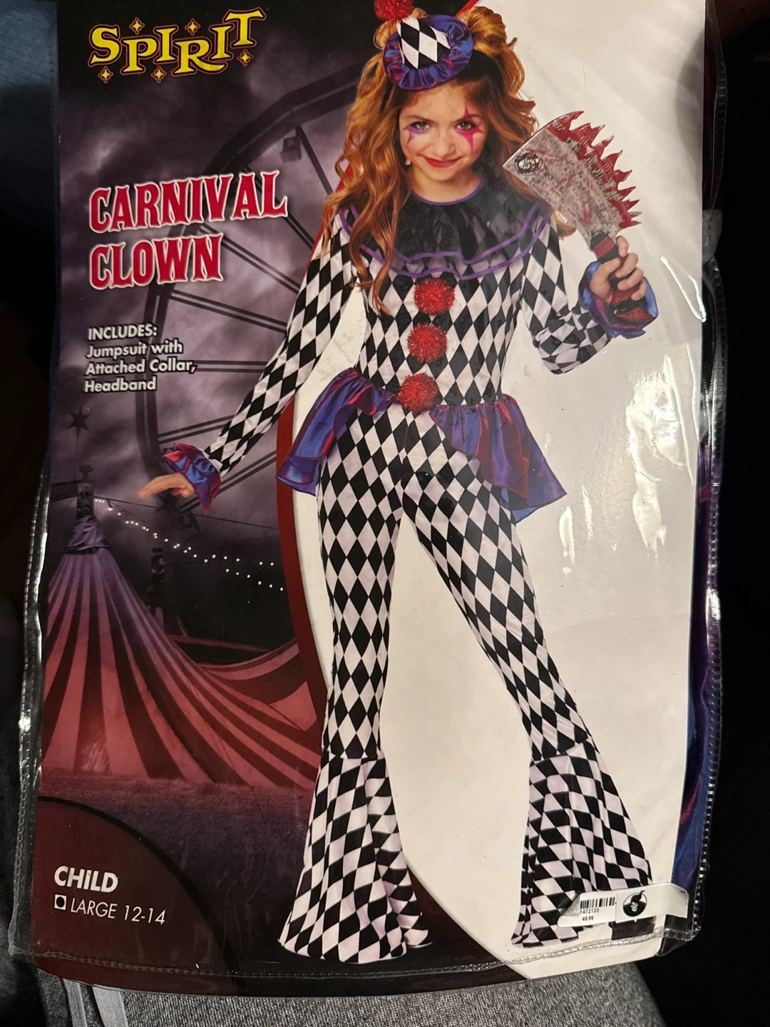 10Selling a Spirit Carnival Clown costume for kids! The size is a child's large, fitting sizes 12-14. The costume includes a jumpsuit with an attached collar and a headband. Originally bought for $59.99