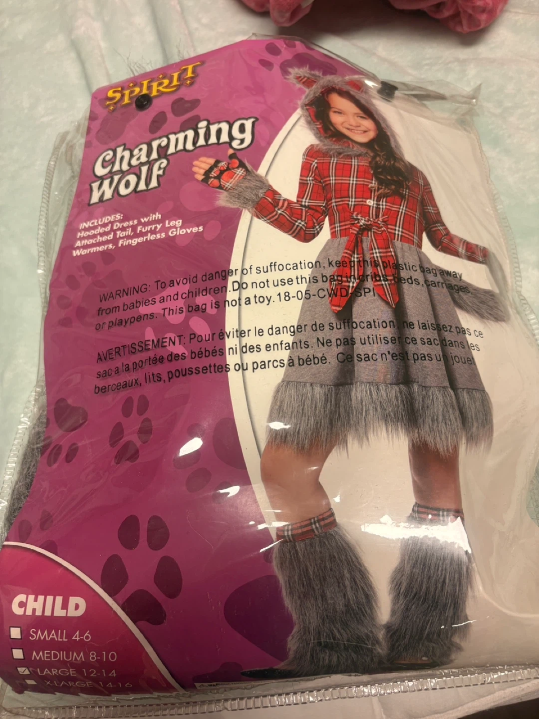 Selling a good condition ,still-in-package Spirit Halloween Charming Wolf costume for kids! This is a child's size X-large (14-16). The costume includes a hooded dress with attached tail, furry leg warmers, and fingerless gloves. Perfect for Halloween or dress-up!