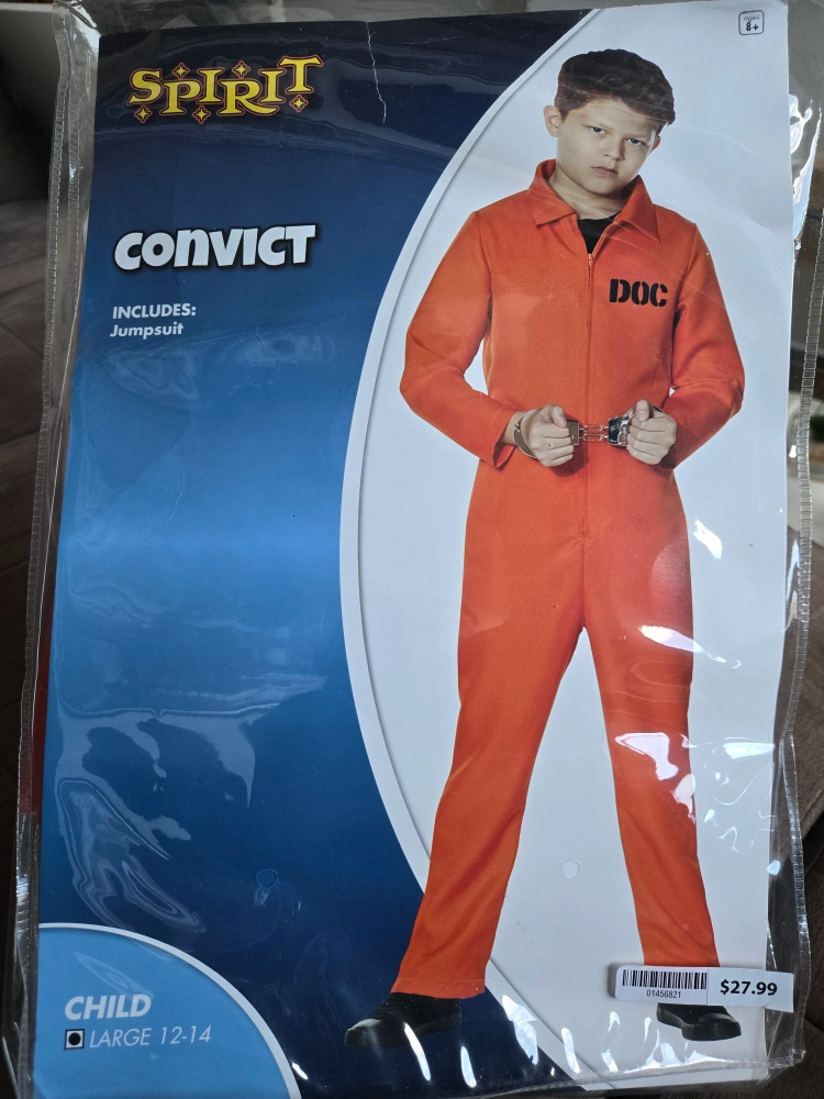 10Selling a Spirit brand convict costume for kids! It's a size large, fitting children sizes 12-14. Used once. The costume includes the jumpsuit. Originally priced at $27.99.