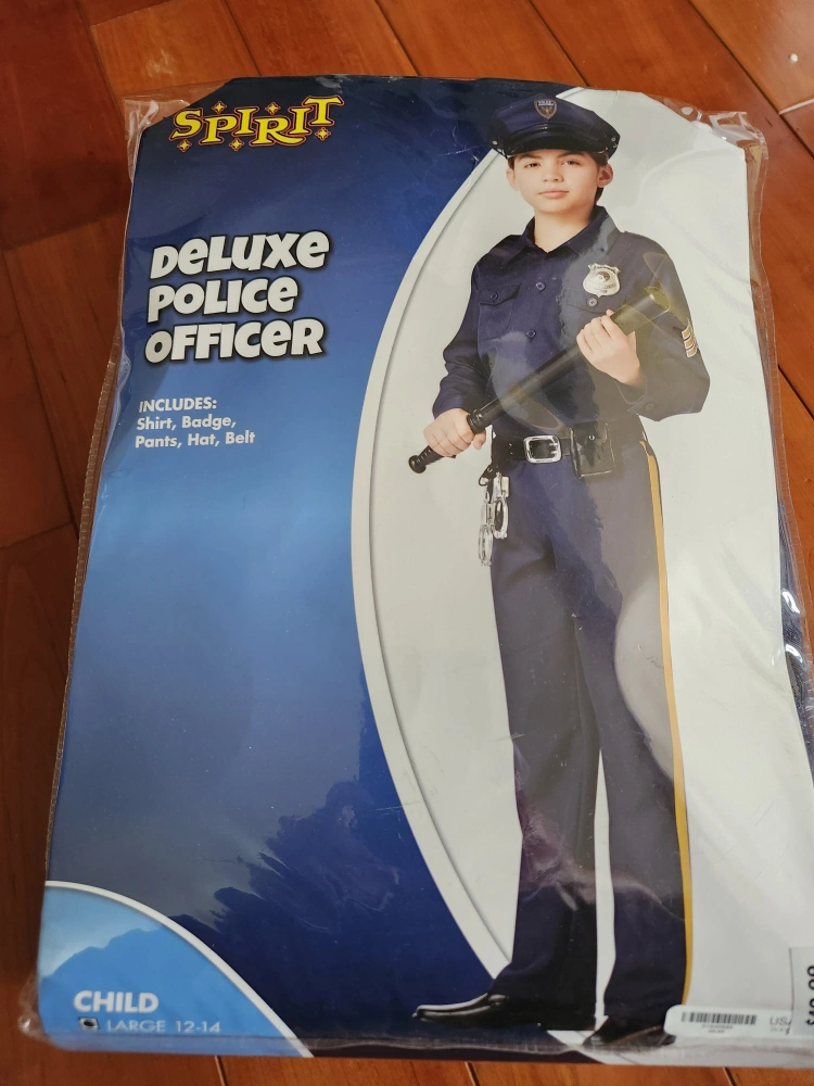 Selling a brand new, still-in-packaging Spirit Deluxe Police Officer costume for children! This is a size large, fitting sizes 12-14. The costume includes the shirt, badge, pants, hat, and belt.