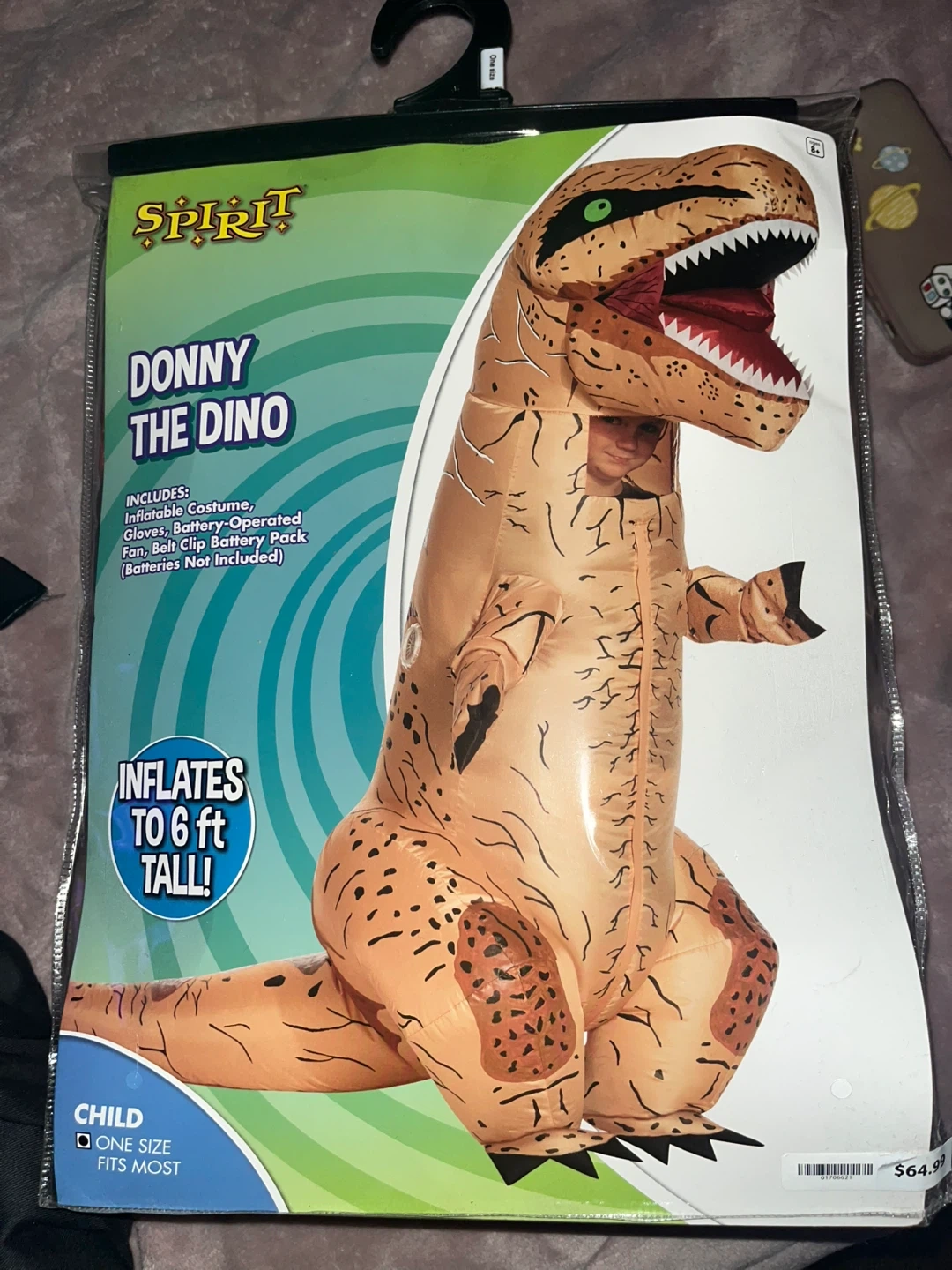 Get ready to roar with this Donny the Dino inflatable costume from Spirit! This fun costume is child-sized and fits most. It inflates to 6 feet tall and includes the inflatable costume, battery-operated fan, and belt clip battery pack (batteries not included). Perfect for Halloween or dress-up fun Would fit age 7-10 (to see through the face mesh at least) $40 OBO !