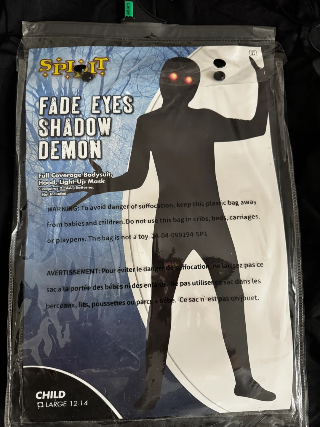 73Get ready for Halloween with this Spirit Fade Eyes Shadow Demon costume! It includes the full coverage bodysuit, hood, and light-up mask. The size is a child's large, fitting sizes 12-14. Perfect for spooky fun!