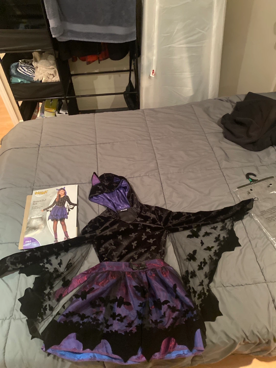 Selling a Spirit Halloween Beautiful Bat costume for kids! It's a child's size large (12-14). The costume includes a hooded dress with attached wings. Perfect for Halloween or dress-up!