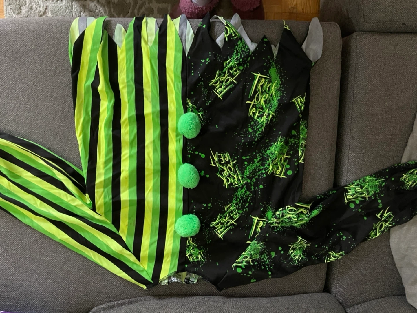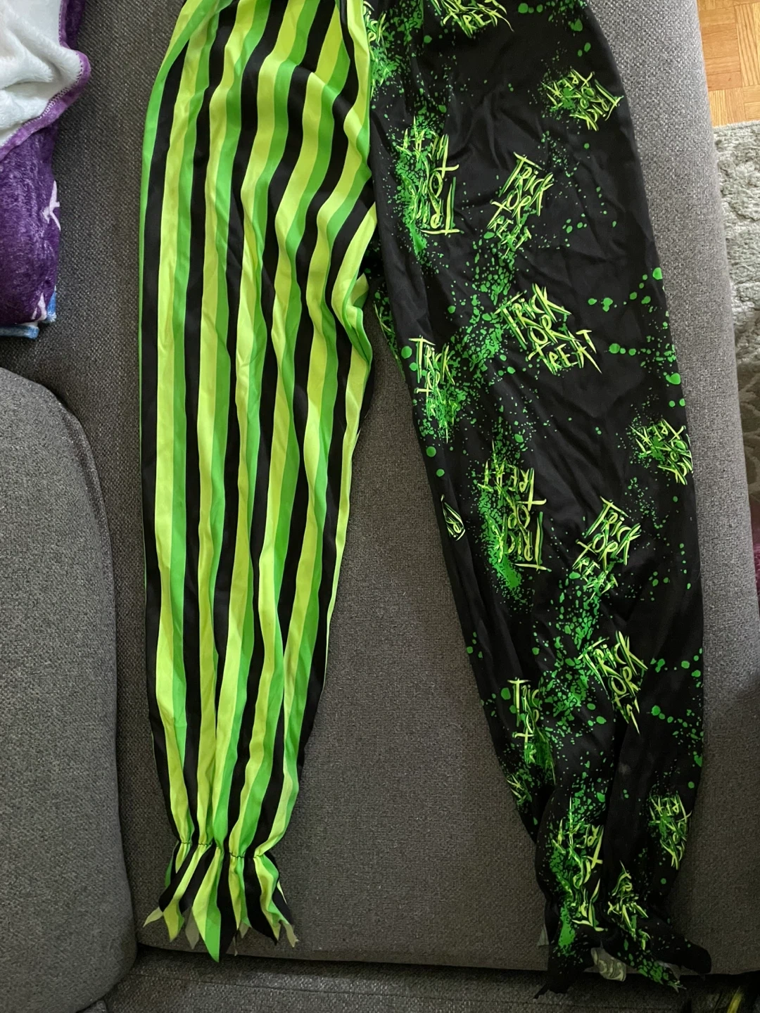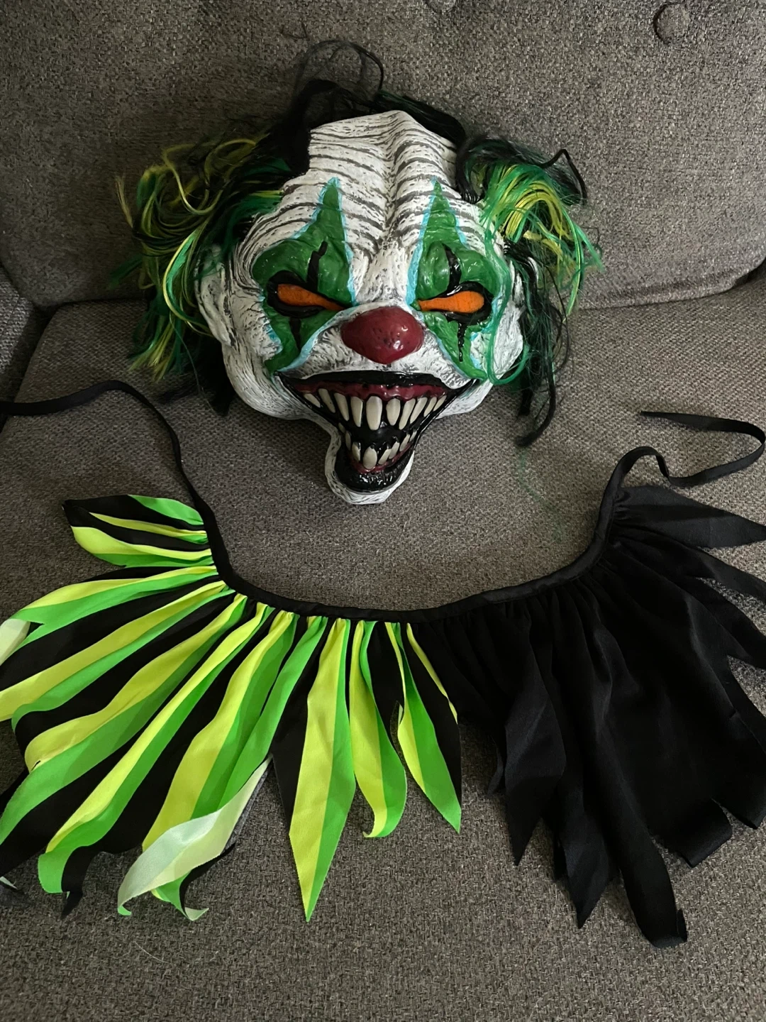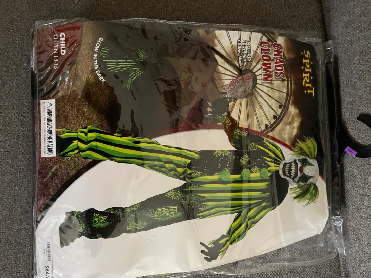 5Get ready for Halloween with this Spirit Halloween Chaos Clown costume! It's a child size 14-16. The costume includes the shirt, pants, collar, and mask. Originally bought for $64.95!